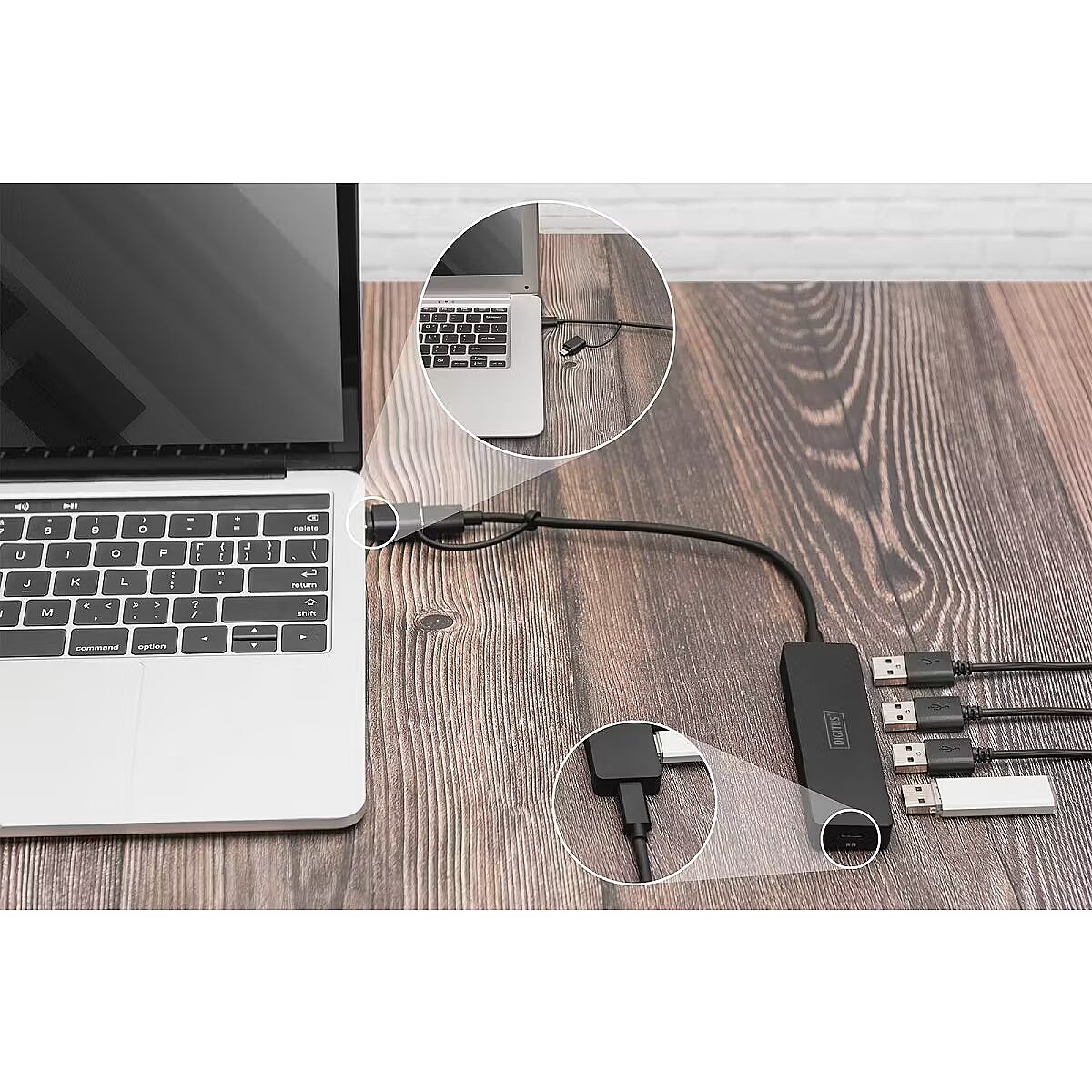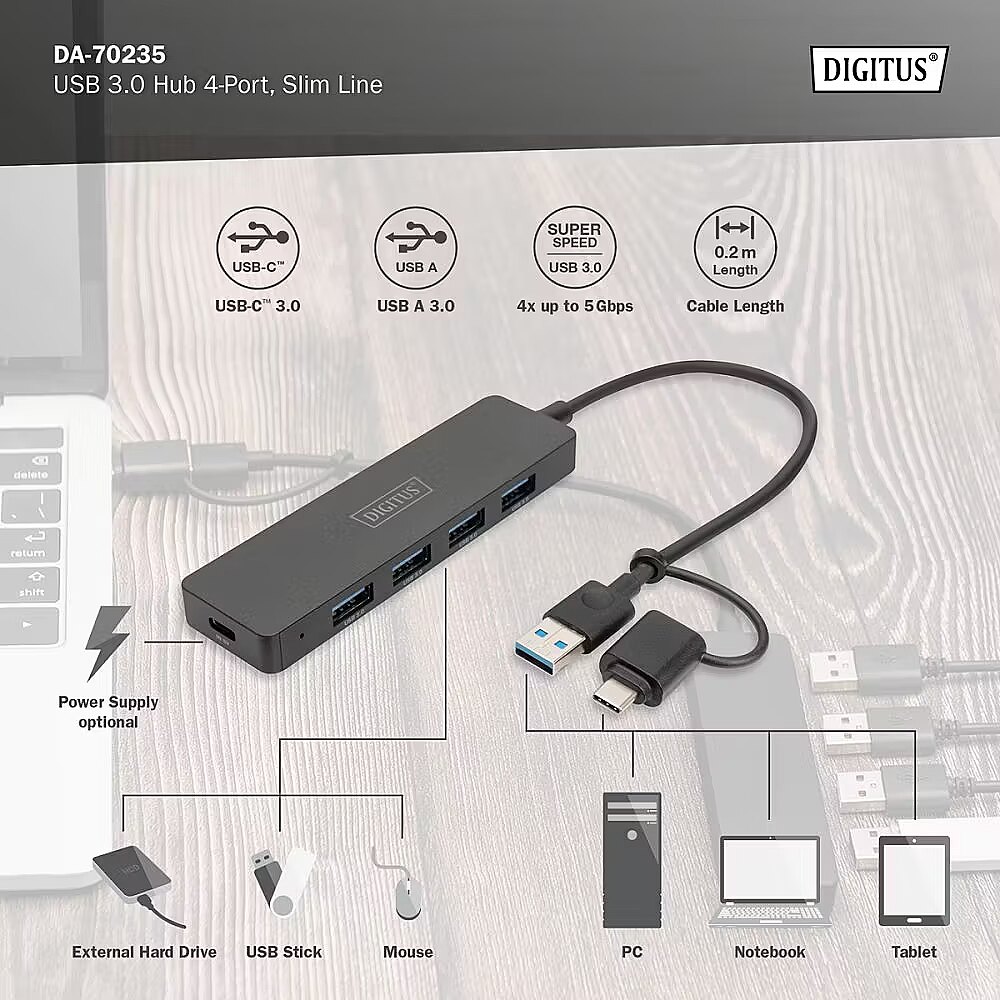 Description - The solution expands the capabilities of a notebook equipped with a USB-C or USB-A port by 4 additional Super-Speed USB ports. The DIGITUS Slim Line USB 3.0 hub is the perfect solution to expand the possibilities in any workplace. You can connect and use up to four USB devices at the same time. This allows convenient use of multiple control/data entry devices or portable drives. Thanks to USB 3.0 technology, the transmission bandwidth can reach speeds of up to 5 Gbps, ensuring fast data exchange. Thanks to its slim design, this 4-port hub is the perfect travel companion, but also a must-have at home and in the office. Additionally, 4 x USB A 3.0 connectors with a bandwidth of up to 5 Gbps in the USB A or USB-C port USB-C 3.0 and USB A 3.0 hub, thanks to the USB-A and USB-C ports, the hub is compatible with a wide range of notebooks The USB hub provides up to four additional connection options for connecting external hard drives, SSDs or other USB devices to your PC, notebook or tablet Thanks to the Super-Speed USB 3.0 standard, fast data transfers of up to 5 Gbps are possible. Additionally, USB 2.0 and USB 1.1 connections are supported thanks to backward compatibility The integrated USB-C connector allows you to additionally power the USB hub (charging cable/adapter not included) Solution compatible with many operating systems, e.g. macOS, Windows and Google Chrome OS Support for Super-Speed (5 Gbps), High-Speed (480 Mbps) and Full-Speed (12 Mbps) data transfers Operating temperature: 0°C to 40°C (35°F to 100°F)