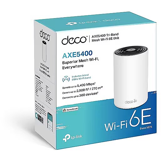 Description - Deco XE75 AXE5400 Tri-Band Mesh Wi-Fi 6E System Boosted Seamless Coverage — Mesh WiFi coverage up to 7,200 ft2 (3-pack), 5,500 ft2 (2-pack), and 2,900 ft2 (1-pack).† True Tri-Band Speed – All three WiFi bands work together to unleash your network’s total speeds up to 5,400 Mbps for 200 devices† AI-Driven Mesh – Unites your home under one name and password while delivering the best connections as you move room to room‡ TP-Link HomeShield – Provides comprehensive network protection, robust parental controls, and real-time IoT security* Universal Compatibility – Backward compatible with all WiFi generations and works with any internet service provider (ISP) and modem☆ Setup Made Easier Than Ever – The Deco app walks you through setup step-by-step.