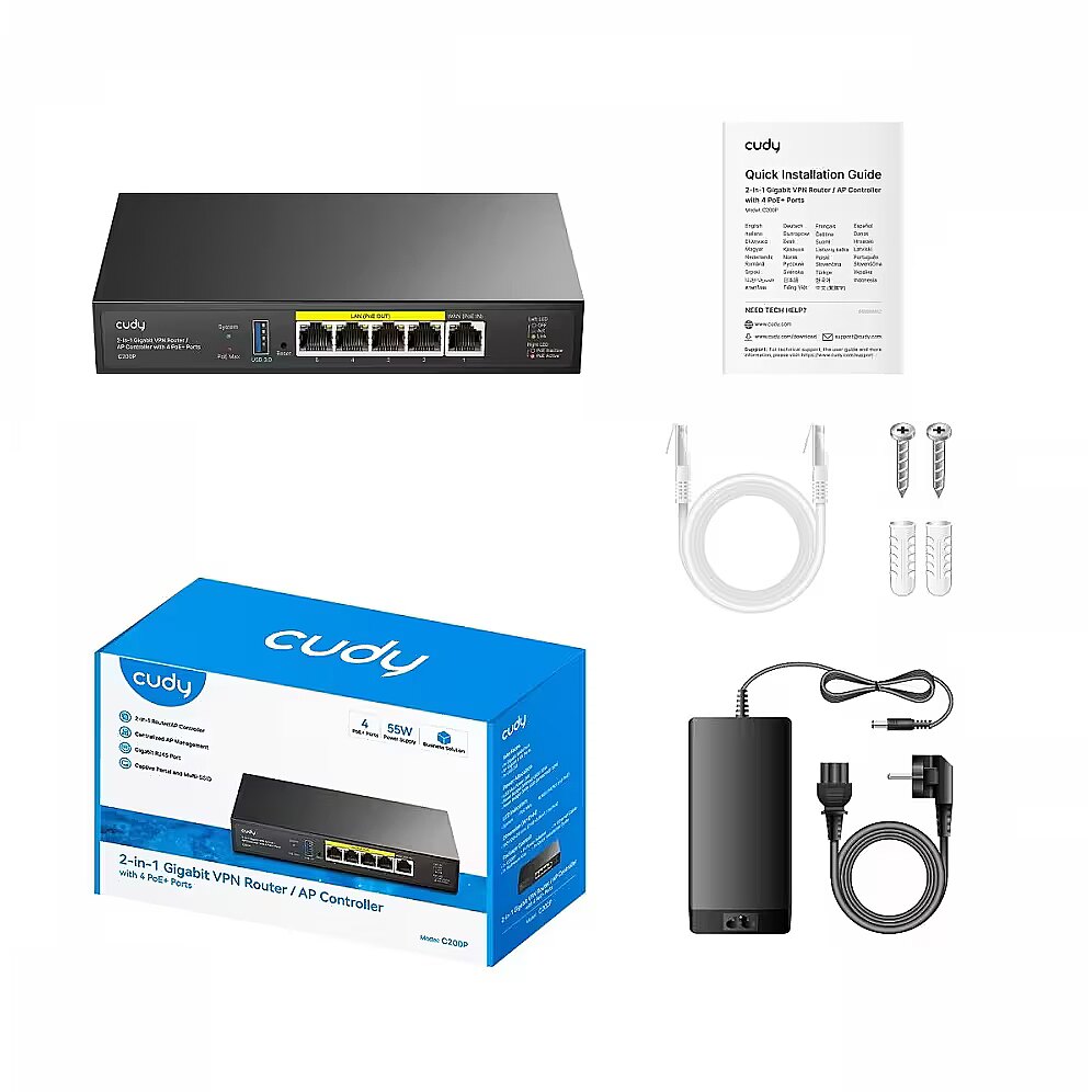 Description - 2-in-1 Router / AP Controller for Small and Medium Businesses with 4 PoE+ Ports Gigabit router that functions as a Cudy Access Point controller for Wi-Fi coverage throughout the home or office, equipped with four PoE outputs and Cudy Mesh features. Specifications: 4 × GbE ports with 802.3at/af Mode A PoE 1 × Gigabit Ethernet port 1 × USB 3.0 port 60W Power Supply Manage up to 200 APs Captive Portal Cudy Mesh, VPN Server and Client
