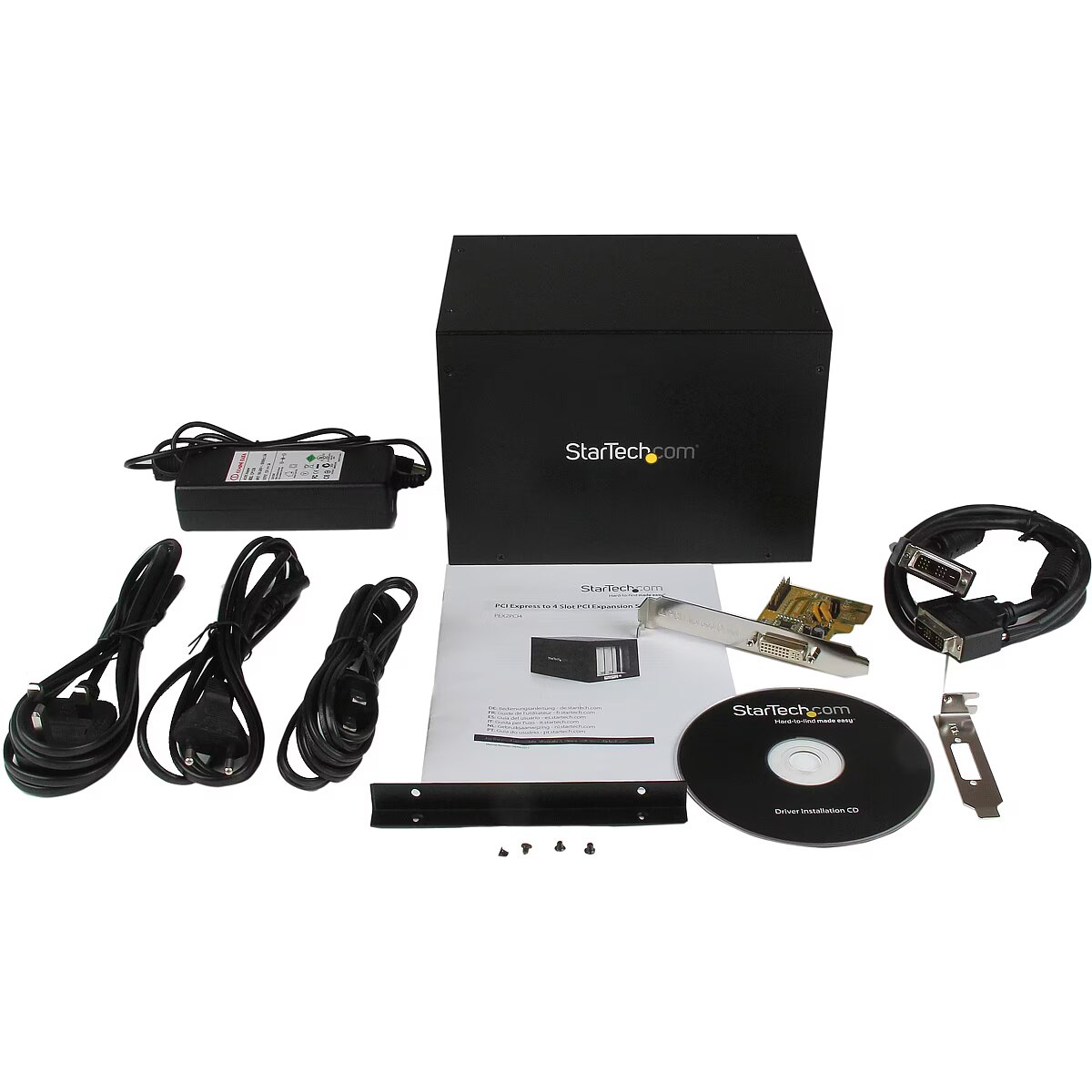 LongDesc - Add four external PCI expansion card slots to a desktop computerStarTech.com's innovative PCI Express to PCI Expansion Chassis provides a quick and simple solution to I/O expandability on almost any PCI Express (PCIe) enabled system. Adding external PCI slots to a server/workstation or laptop, this cost-effective and time-saving method of simply adding additional PCI cards to a server/workstation or providing a platform to be able to swap PCI add-in cards between a mobile and desktop setup is the optimal method of maximizing the I/O capabilities of new or existing systems.The external expansion chassis adds four PCI slots (32-bit/33MHz) to the host computer system, through a single PCI Express connection. Providing total bandwidth of up to 250MBps from the x1 PCIe host controller card, which allows the host computer to function as though the cards in the expansion chassis were connected directly to the motherboard. The PCIe controller card connects directly to the PCI Expansion box with an included DVI cable for a reliable, high quality connection.A dependable I/O expansion solution, the Expansion Chassis is backed by StarTech.com's 2-year warranty and free lifetime technical support.The StarTech.com Advantage