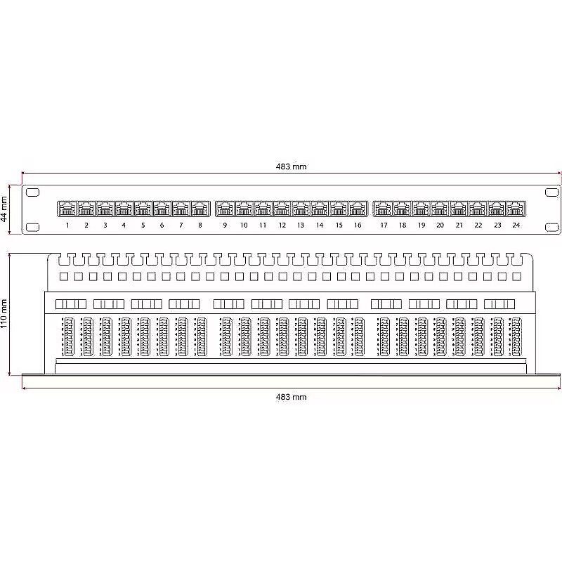 Szerokość: 19" Wysokość: 1U Kategoria: 5E Klasa: D / 100 MHz / 1 Gb/s Ekran: nie Ilość portów: 24 RJ45 z polami opisowymi Półka montażowa: tak Obudowa: