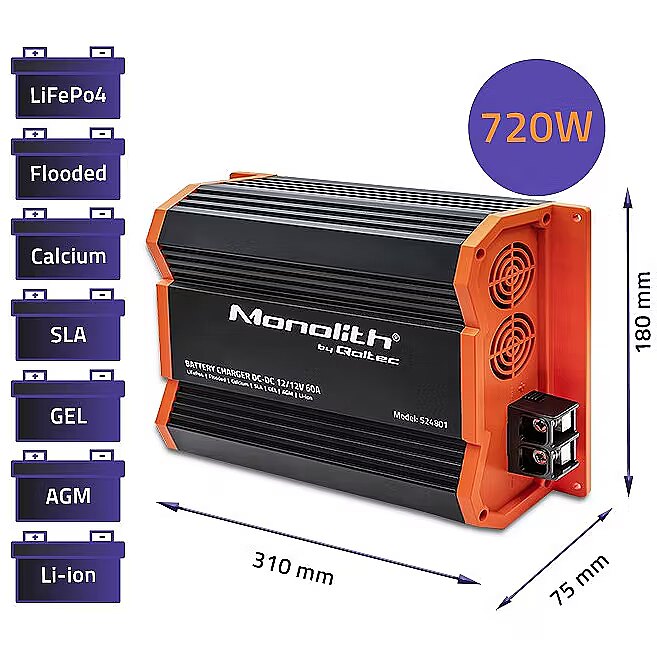 Our Monolith charger designed to work without trouble with a wide range of different types of batteries including AGM, GEL, calcium, SLA, Li-ion, EFB and LiFePO4 providing them with a stable and safe power source. Ideal for use in 4-wheel drive vehicles, i.e. caravans and campers, trucks, other commercial vehicles, but will also be a good choice for boat and yacht owners.