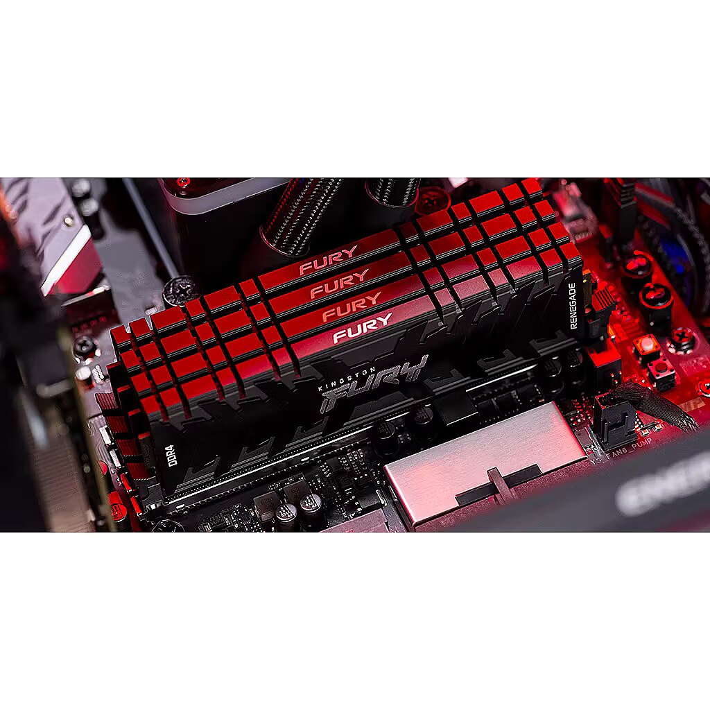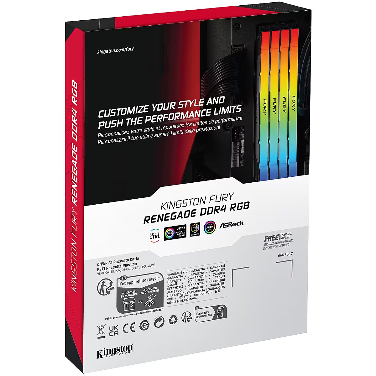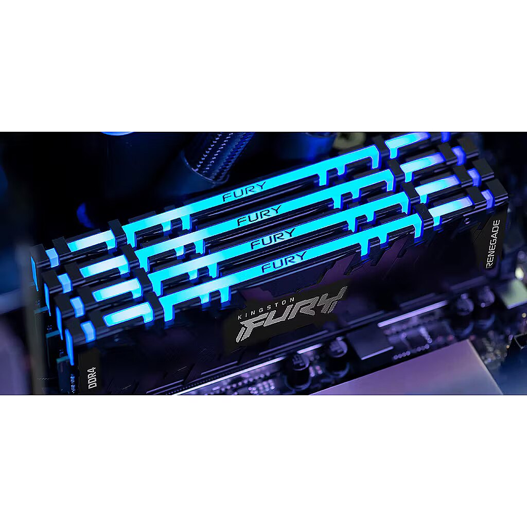 LongDesc - Kingston FURY™ Renegade DDR4 RGB* is the ideal upgrade for the power user who wants cutting-edge performance, with stylish RGB in their AMD- or Intel-based system. 10 LEDs create dynamic RGB lighting with Kingston FURY's patented Infrared Sync Technology™ for smooth, coordinated effects. Put in hours for work or play, crank up your frame rate, improve your workflow and edit gameplay in a flash thanks to speeds of up to 4600MT/s[*]* paired with quick latencies. The intense, stylish two-tone black heat spreader with black PCB is for fun and function to keep your system cool. Available in single module capacities of 8GB–32GB and kits of 2, 4 and 8 with capacities of 16GB–256GB. [Kingston FURY Renegade DDR4 RGB is Ready for AMD Ryzen, and Intel® XMP Certified] or XMP Ready.Stunning RGB styleBring your workstation to life with smooth, stunning RGB lighting effects*Patented Kingston FURY™ Infrared Sync Technology™RGB lighting stays synced thanks to Kingston FURY's Infrared Sync TechnologyPowerful aluminium heat spreader displays smooth RGB effectsThe two-tone black aluminium heat spreader and black PCB highlight the stunning RGB effects to keep your rig running and looking sharp.Intel XMP Certified or Read profilesIntel Extreme Memory Profile technology makes it possible to overclock with ease. Simply select one of the built-in, hand-tuned profiles in your BIOS to get the benefits of overclocking.Ready for AMD Ryzen™Get memory that’s Ready for Ryzen and will seamlessly integrate with your AMD-based system.