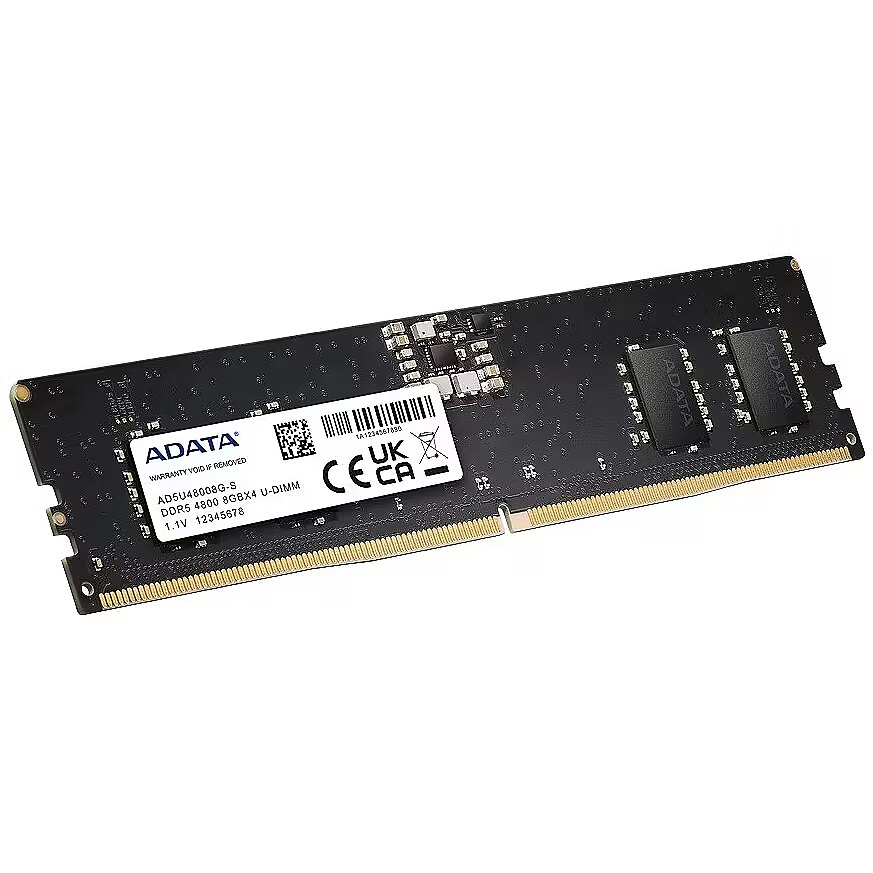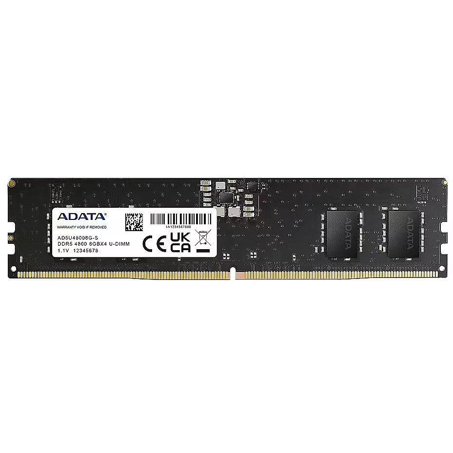 Technical_details - DIMM 8GB DDR5-4800 memory The ADATA AD5U48008G-S is a Premier Series 8GB DDR5-4800 (PC5-38400) memory module. The module supports a timing of 40 at 4800 MHz and requires 1.1 V voltage. Type: SDRAM DDR5 Color: Black EAN code: 4711085936417 Manufacturer part number: AD5U48008G-S Series: Prime Capacity: 8GB Quantity: 1 piece Design: DIMM Connector: 288 pin Default: DDR5-4800 (PC5-38400) Physical clock: 2400 MHz Timings: CAS Latency (CL) | 40