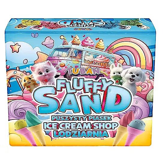 Description - Fluffy sand - Ice cream parlour set Fluffy sand is extremely lightweight and does not spill, plus it smells like the bubble gum children love. It is easy to form structures and shapes out of the sand. Playing with it is an extraordinary sensory pleasure. IMPORTANT: Our products are safe for children. They contain no toxic substances. MANUFACTURED IN POLAND.