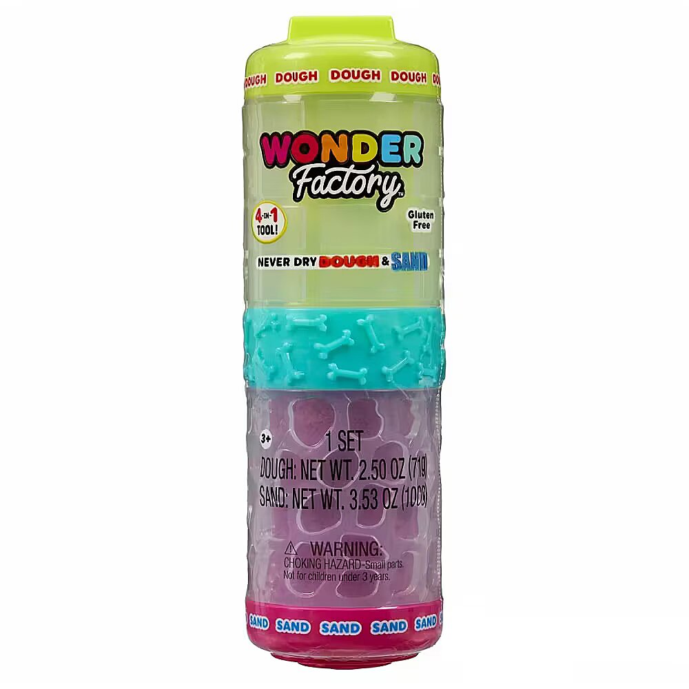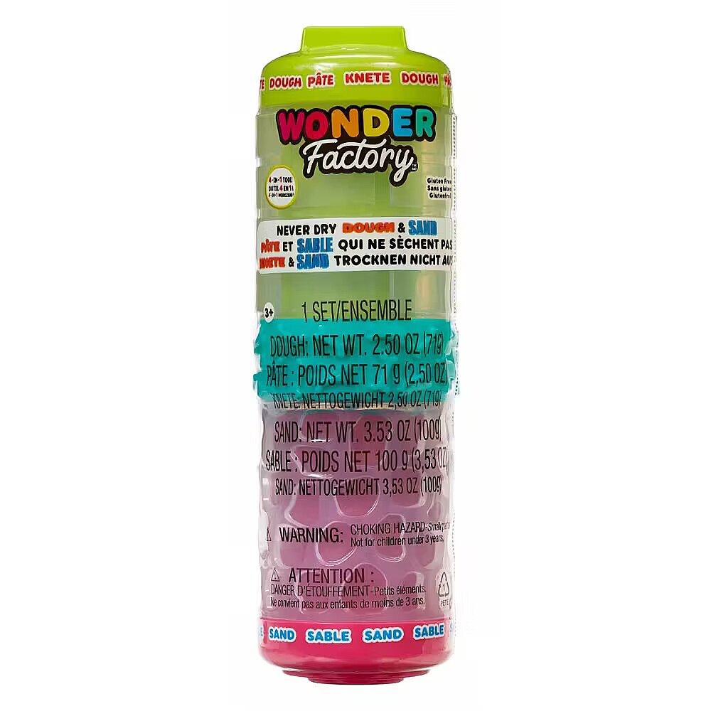 Gwarantuje świetną zabawę, dzięki dotykaniu naszej unikalnej masy I piasku! Zawiera naszą unikalną masę i piasek Wonder Factory nie wysycha i jest bezglutenowy! Narzędzie 4-w-1: Roluj! Stempluj! Łącz! Przechowuj! Zrównoważone opakowanie; każdy pojemnik z masą i piaskiem jest częścią zabawy z wzorami, stemplami i innymi dodatkami! Zawiera: 1 tubkę piasku i 1 tubkę masy, 2 nakrętki z różnymi stemplami do twojej masy i piasku oraz 1 łącznik z wzorami do wytaczania w twojej masie i/lub piasku. Możesz wymieszać masę i piasek, aby stworzyć nowy związek o innej teksturze. Tyle wesołych kolorów do zabawy!