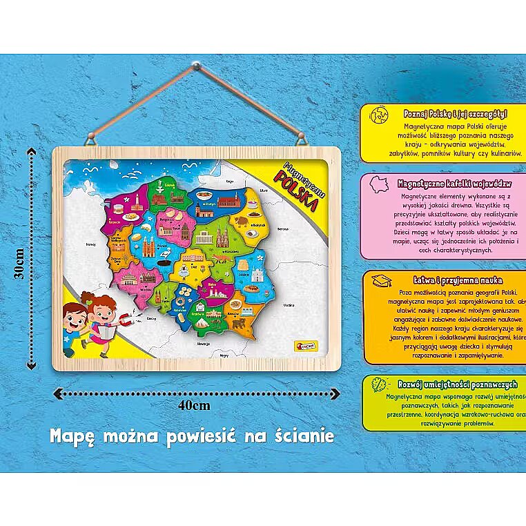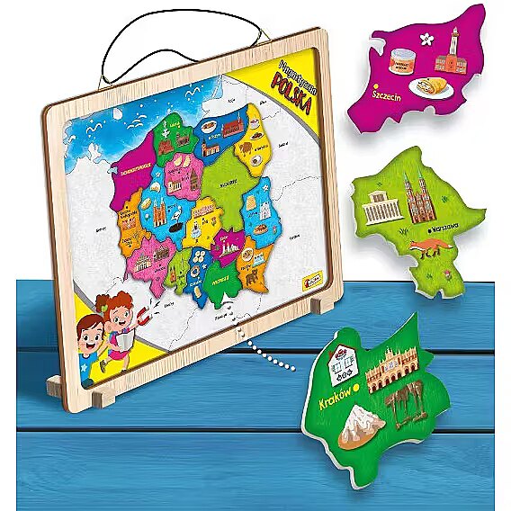 Description - A unique magnetic map of Poland that lets you discover all its secrets! Each piece represents a different region of the country and includes cultural landmarks, allowing children to learn about the distinctive features and hidden treasures of Poland.