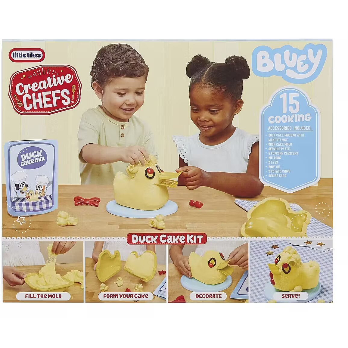 LongDesc - The Little Tikes Creative Chefs Bluey Duck Cake is the perfect playset for kids to explore the fun of making their own delicious duck cake as seen on Bluey. Featuring visual recipe cards and reusable Make-It! Mix ingredients, this cooking kit teaches young chefs the basics of making dessert while engaging in imaginative role play.This cooking set includes hyper-detailed play food and utensils to help kids prepare, assemble, and decorate their own desserts. The multi-step play pattern and reusable accessories allow kids to enjoy this kit for both engaging solo play and collaborative group play.Encouraging creativity, motor skill development, and hands-on fun, the Creative Chefs Bluey Duck Cake Kit offers hours of engaging playtime that feels just like a real cooking experience.Consumer Note: Make-It! Mix play sand is not edible.