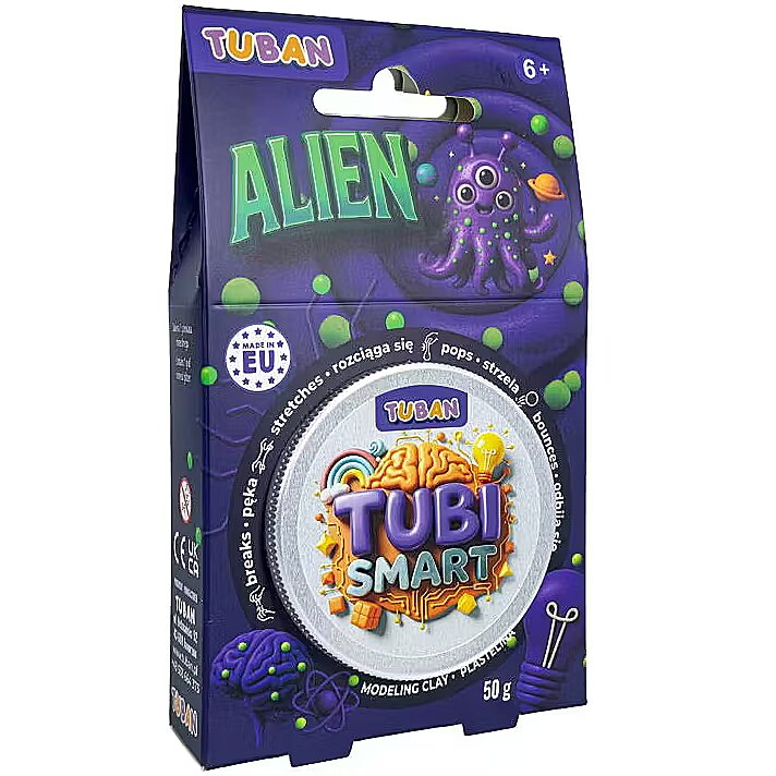 Description - Tubi Smart Playdough - Alien 50g Discover a modeling clay in a unique purple color, to which you can add yellow beads for even more fun. This extraordinary clay stretches, breaks, and bounces, bringing loads of joy with every touch! You can knead it, shape it, and experiment with endless new ways to play-only your imagination sets the limit. When playtime is over, simply store the clay in a sealed jar to enjoy its amazing properties for a long time. MADE IN POLAND.