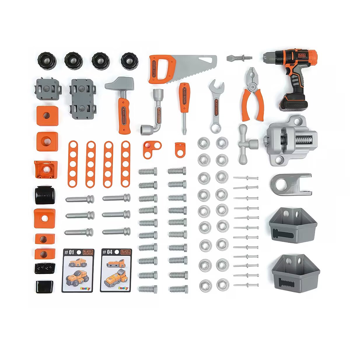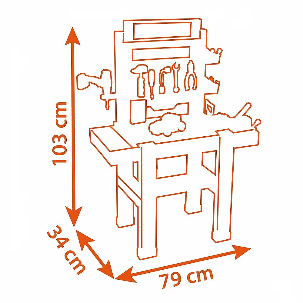 Description - Black+Decker Bricolo Center Workshop Realistic workbench with shelves, nailing area, with 92 accessories including screwdrivers, hammer, saw, pliers, vice, mechanical screwdriver, car to build. Lots of play options - realistic imitation workbench with shelves, space for nailing, 92 accessories including 7 tools: screwdriver, hammer, saw, pliers, vice, mechanical screwdriver. The DIY table is richly equipped with a drill, screws, nuts, nails, construction plates, mechanical ruler pliers, pipe spanner, vice spanner. The educational toy combines learning with challenging play, the included self-build car teaches patience and strengthens concentration. The workshop from Smoby influences the development of children's motor skills and at the same time provides safe and joyful play, additional storage space will encourage tidiness in the workshop. Made in France, the Smoby Black+Decker set measures 79 x 34 x 103 cm and is suitable for children aged 3 and over. Construct, build and repair - many accessories that can be freely combined, screwed, unscrewed (screws, nuts, slats with holes), which promotes hand-eye coordination, dexterity and fine motor skills. All tools and components can be easily stored, thanks to the included two baskets and two convenient wings as extensions of the tabletop on both sides. The Black + Decker Bricolo Center Workbench stands out with its many accessories that will keep you entertained for hours, stimulating your imagination countless times. This set is the best gift for any child who likes to take on new challenges. The licensed Black+Decker workshop created by the renowned French manufacturer Smoby, which has been enabling children to discover the mysterious world and principles of construction since 1924. The workshop from Smoby is a fitting gift for those children who expect interesting solutions. Made with attention to the smallest details, they develop creativity and the logical combination of construction elements.