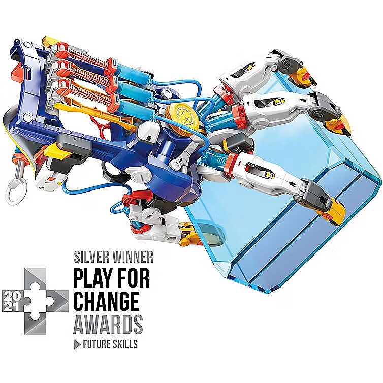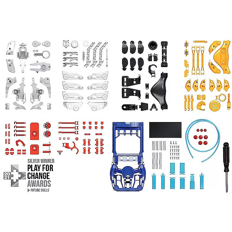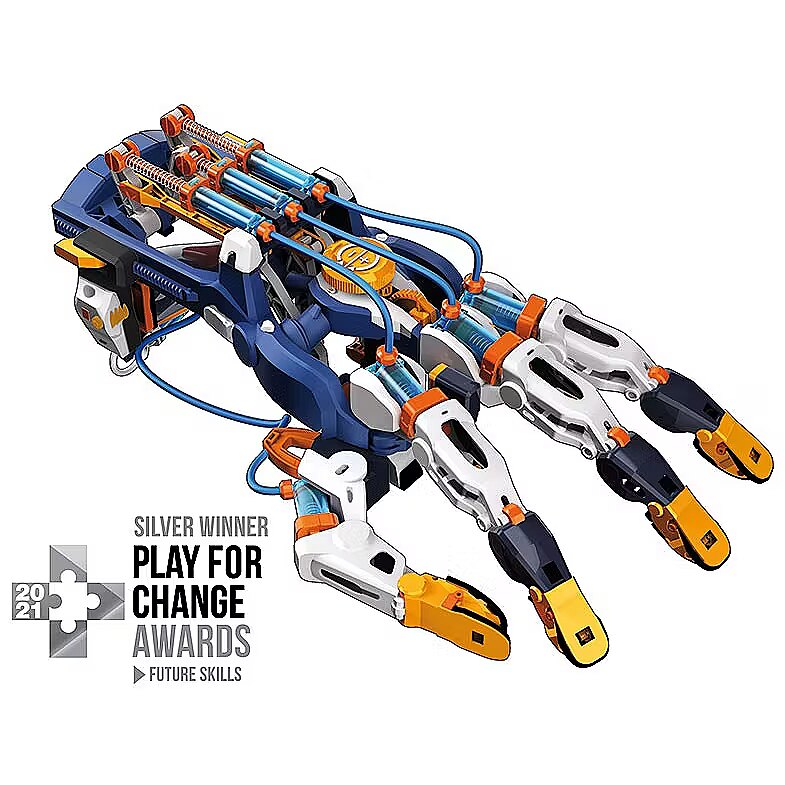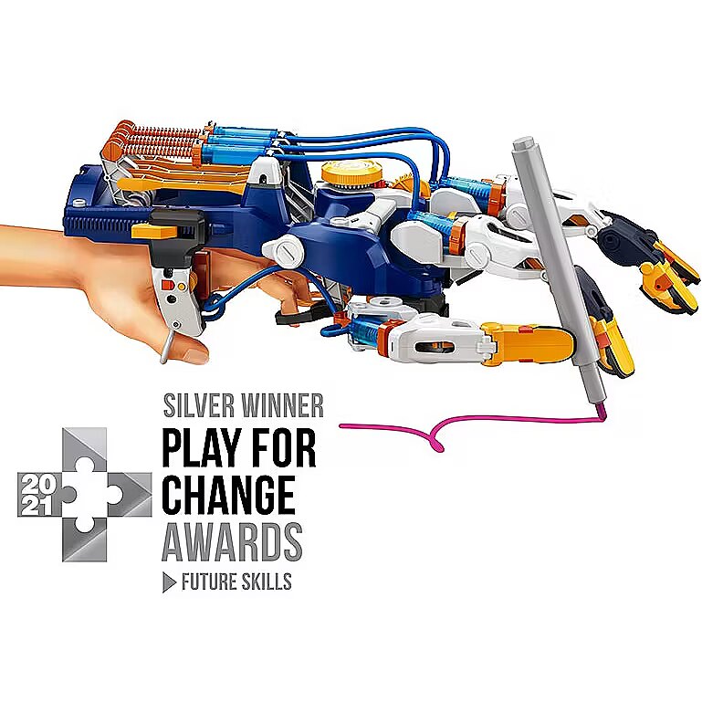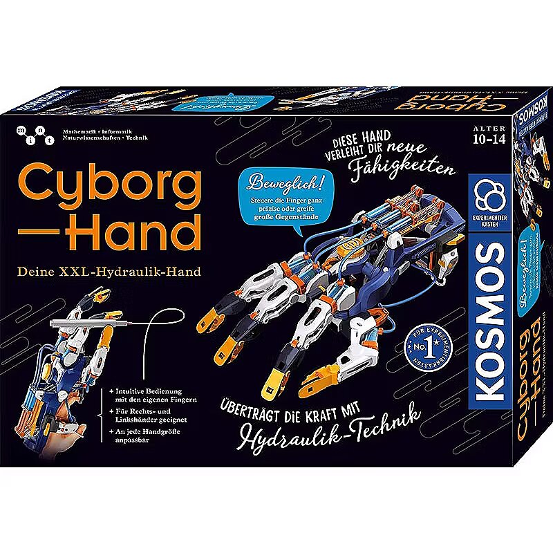 Description - Cyborg hand An educational kit with which we can assemble a hydraulic cyborg hand in XXL format ourselves! During the assembly process you can learn about mechanics, electronics and hydraulics. Once the cyborg hand has been assembled from the parts included in the kit, it can be operated like a human hand. Comprehensive instructions not only inform about the assembly process, but also provide an introduction to the fascinating world of cyborgs and exoskeletons. The cyborg hand is suitable for right- and left-handers and is suitable for hands of any size. With it, you can precisely control your fingers or grasp large objects. As the hand works on hydraulic principles, it does not require any additional power supply.