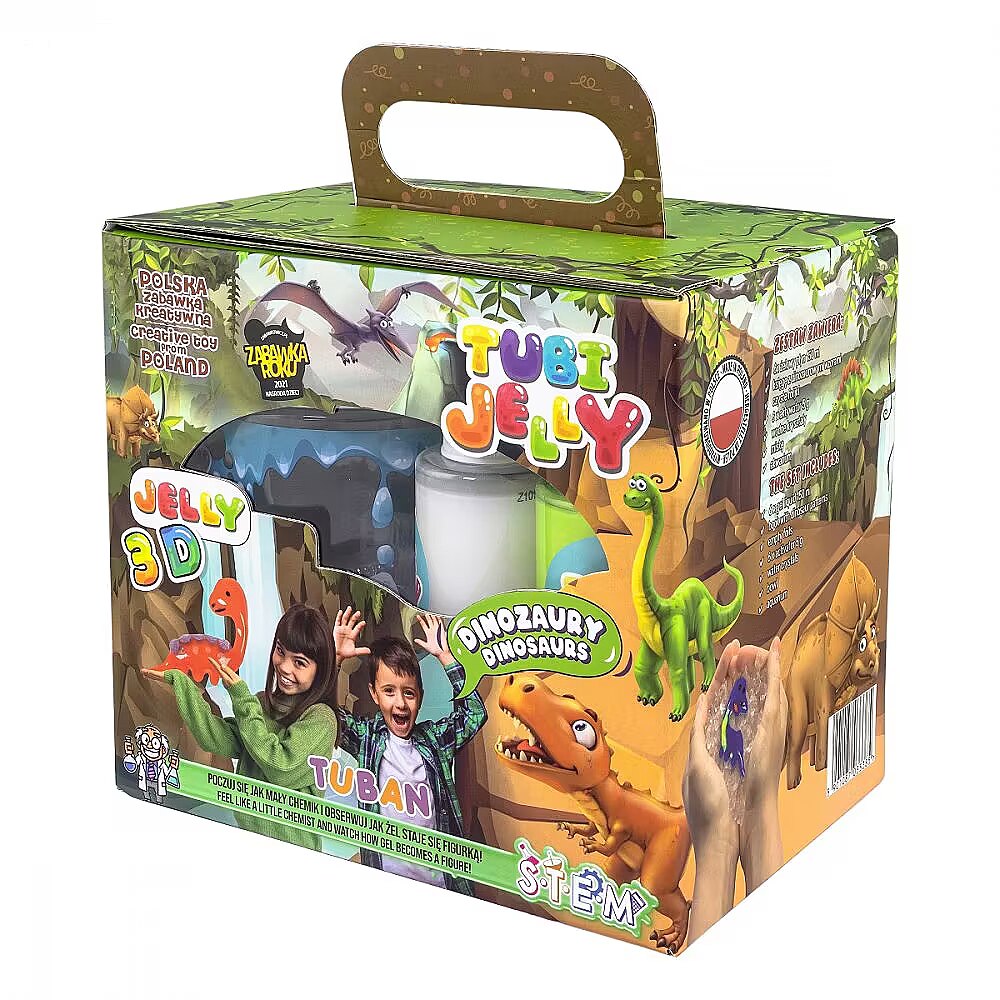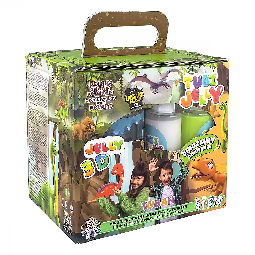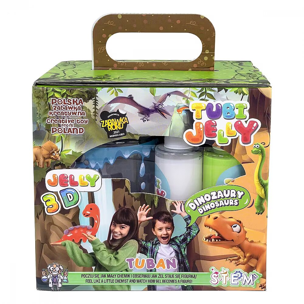 Description - Tubi Jelly set of 6 colours + small aquarium - Dinosaurs Do you love dinosaurs and enjoy playing with them? With TUBI JELLY gel liquids you will be able to create your own gel collection of them! TUBI JELLY gel liquids have an extraordinary power. The shapes created from them turn into three-dimensional figures. All you need to do is paint the dinosaur shape of your choice onto the included foil. You can use one of our 16 suggested designs, or create your own original dinosaur. Then place it in the container with the dissolved activator for a few moments and watch it transform from a flat picture into a 3D creature! This is truly fascinating fun. The finished dinosaurs will stay with you for longer, as we have included a special aquarium for them to live in. How to play. Step 1. Prepare an aquarium with water crystals for your dinosaurs to live in. To do this, fill the aquarium with water and pour 1 sachet of crystals into it. The water should be quite warm, but not hot, then the crystals will grow faster. When the crystals swell, the aquarium will be ready to receive its tenants, the dinosaurs you are about to create. Step 2. In the rectangular container we included in the kit, prepare the activator needed to harden the jellies. To do this, pour the powder into 400 ml of cold water and stir until it dissolves completely. Step 3. Choose your favourite from the pattern book and cut it out. Then prepare tubes of those gel colours you will need for painting. Slowly outline the shape of the design on the foil, drawing with the gel liquid first on the outlines and then on the inner parts of the design. Try not to make the layer of gel too thick, as too much gel liquid will cause the pattern to melt and the gel itself will take a long time to harden. If there are small elements on your design, such as eyes or a face, do them at the end so they don't have time to melt too much. Step 4. Place the foil with the pattern painted on it in the activator. After about 2 minutes, begin to gently move it around. The activator should gradually get under the jelly roll, causing it to break off completely. Repeat this process for 3-4 minutes, until the jelly is completely run off the foil. But don't take the dinosaur out yet, hold it in the activator for a while. The longer the jelly sits in it, the firmer it will become. NOTE! Do not leave the foil with the painted dinosaur in the activator for a long time without moving it. You may find later that the figure cannot be detached from the foil, and any attempt to tear it off will end up destroying the results of your work. Step 5. Rinse the finished and solidified dinosaur-shaped gel in clean water to remove any remaining activator from its surface. After this bath you can finally play with your dinosaur. When you've finished playing with it, put it back in the aquarium and set about creating a companion for it.