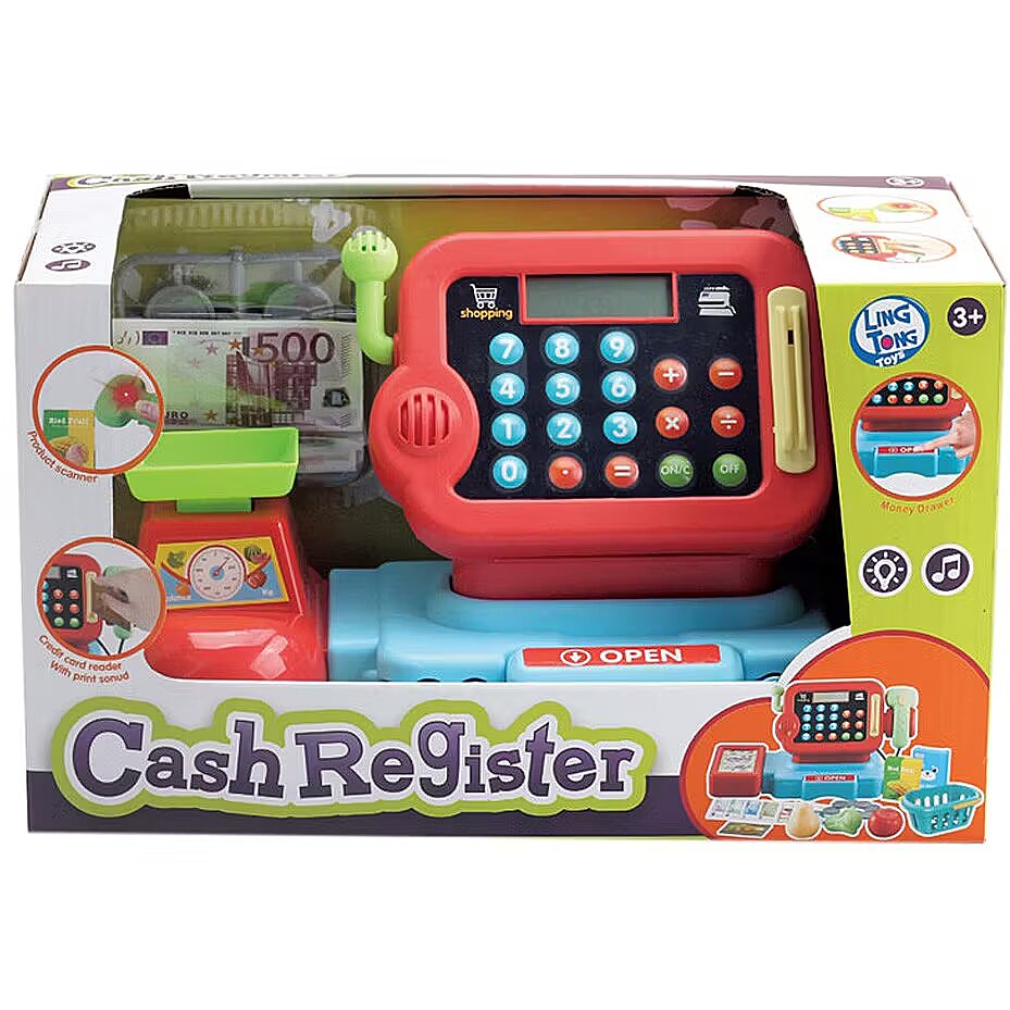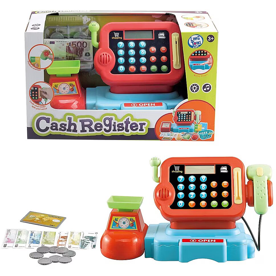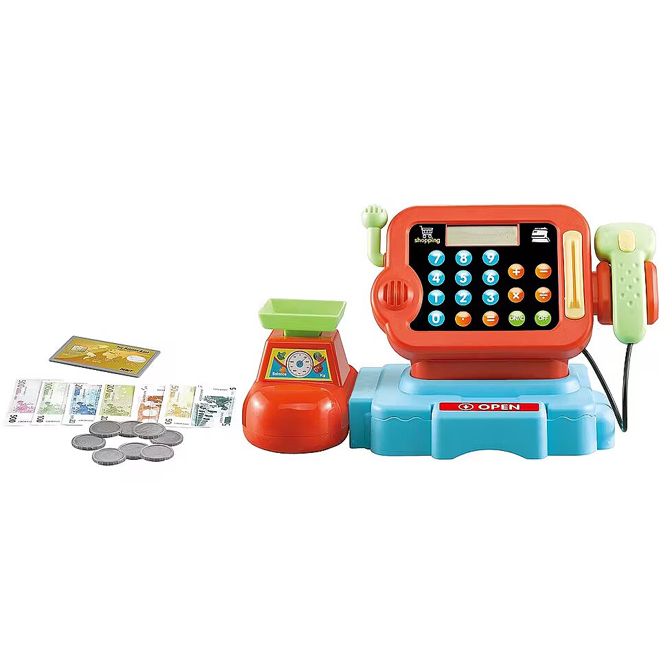 Description - Shop cash register with scanner and scales and money. Batteries required - 2xAA (not included) Package dimensions: 33 x 16 x 20 cm Age 3+