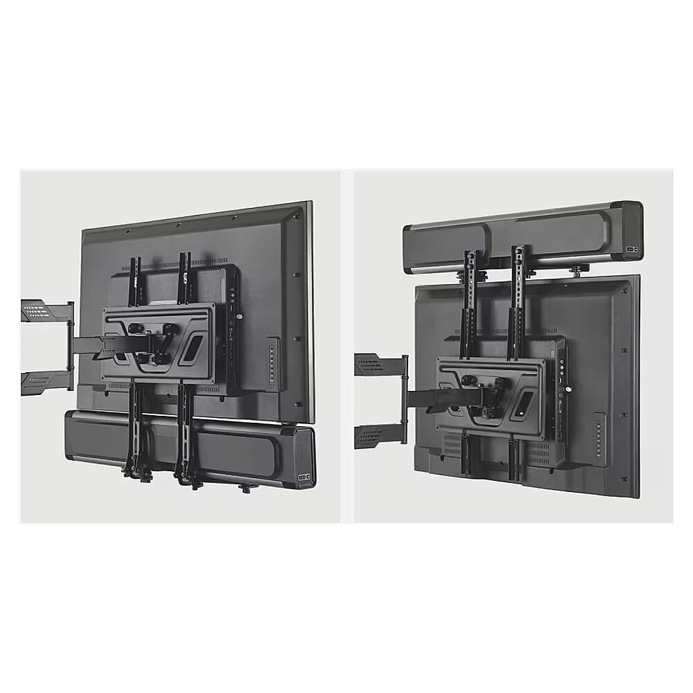 Other features - Compatible with VESA TVs Direct mounting on the TV via the VESA mounting holes Adjustable mounting: +/- 90 degrees Compatible with soundbars from 40 to 182 mm depth