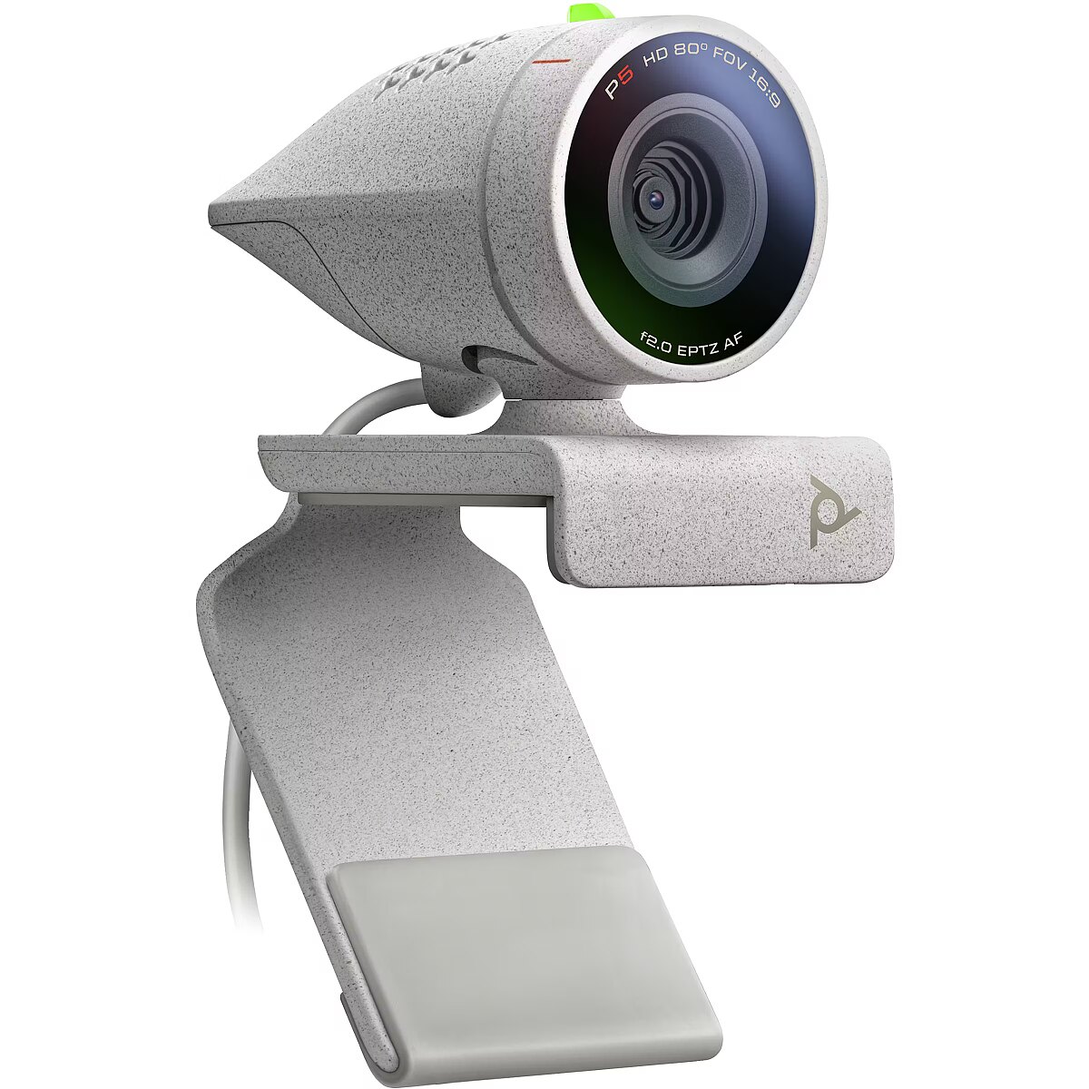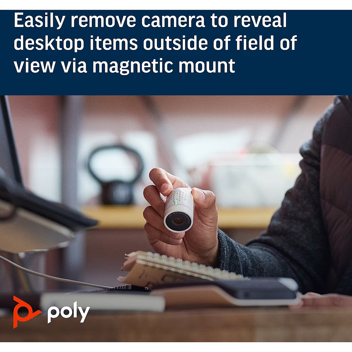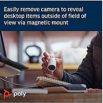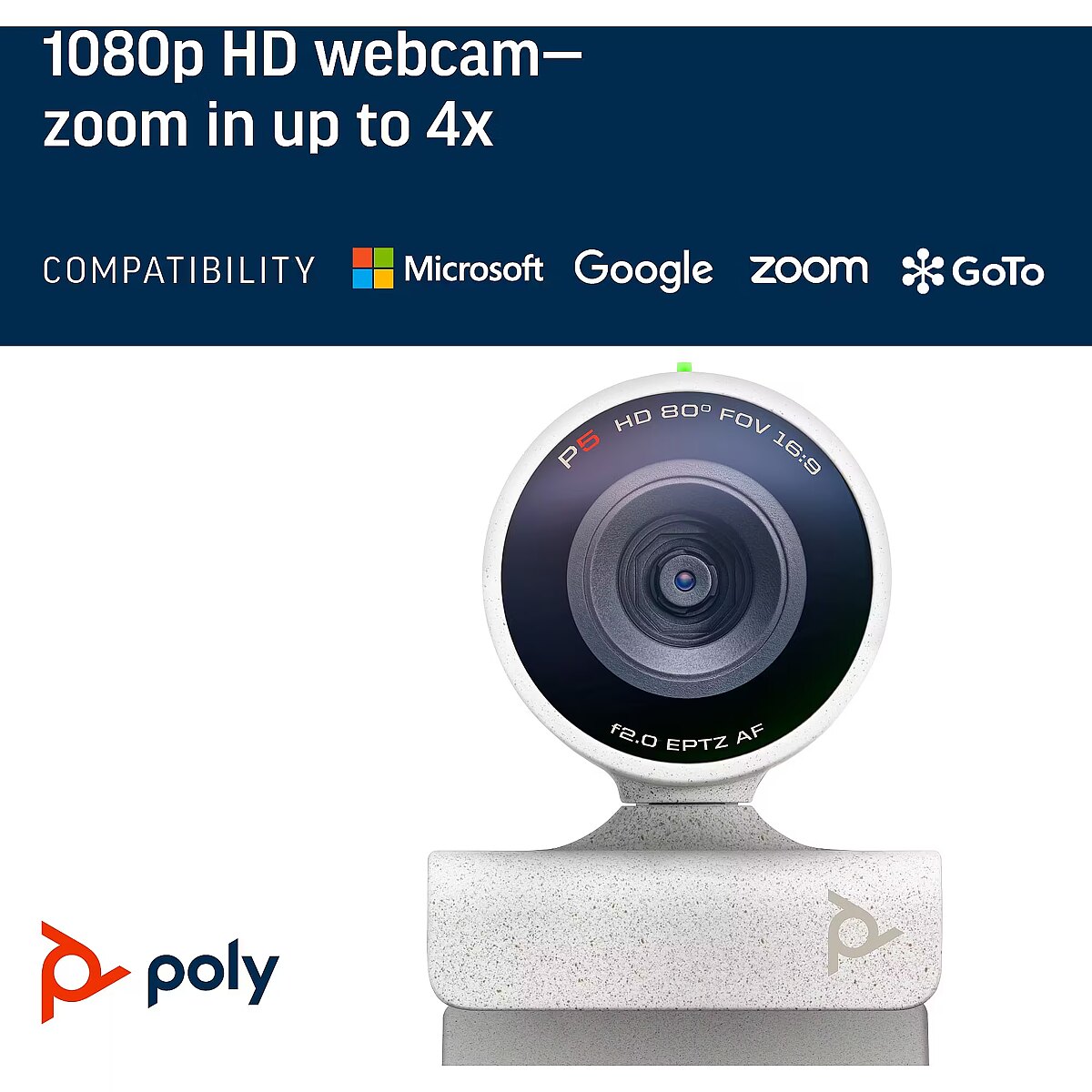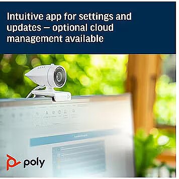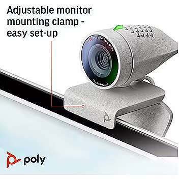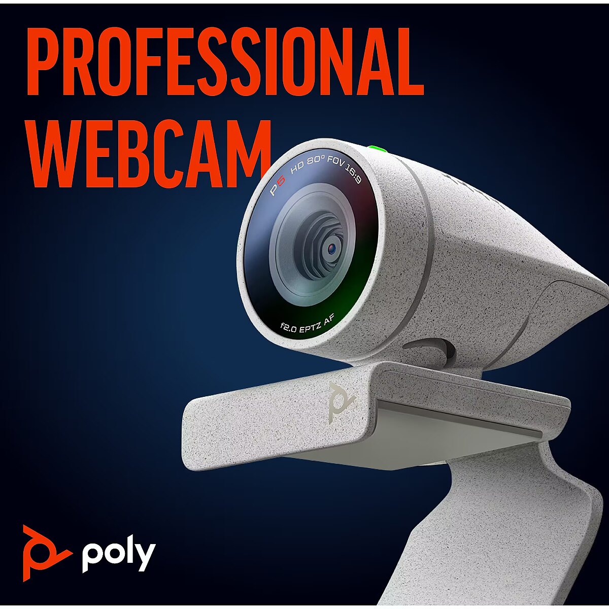LongDesc - The Poly Studio P5 webcam ensures you look great on video calls at home, in the office, or wherever you’re working. Quality camera optics are fine-tuned so you come across clearly with a powerful, professional-quality image. The Poly Studio P5 webcam ensures you look your best on video calls at home, in the office, or wherever you’re working.Quality camera opticsPut your best foot forward on every call with optics specially designed for video conferencing. Gain confidence that you are clearly seen with brilliant colors designed to show you at your best.Low-light compensationDon’t let imperfect lighting deteriorate your image during a call. Automatic low-light compensation lets you look your best even in dim environments.Precise camera viewWith people working from more places, background movement, clutter, and household members can detract from your calls. A narrow field of view keeps the focus on the conversation at hand rather than your surroundings.Pro-grade resolutionA grainy video feed can be distracting for colleagues. With 1080p resolution and a 4x digital zoom camera, you can be sure that your video is crystal clear.Directional microphoneYou’re heard clearly with a built-in directional microphone that focuses on your voice, not the noise around you.
