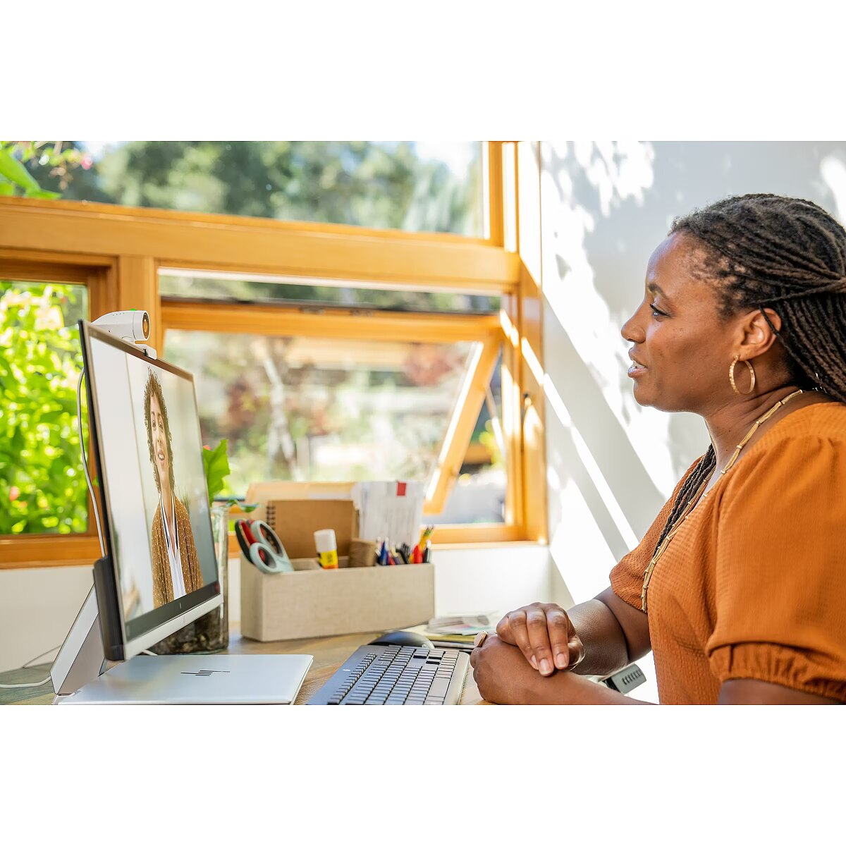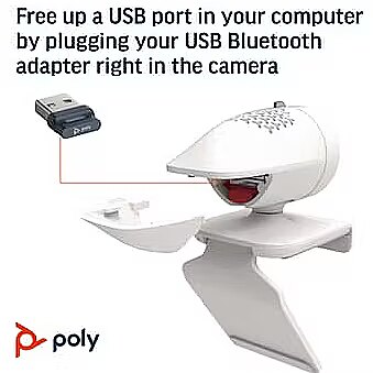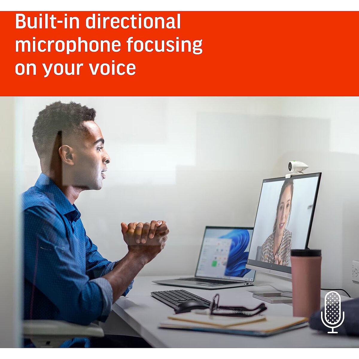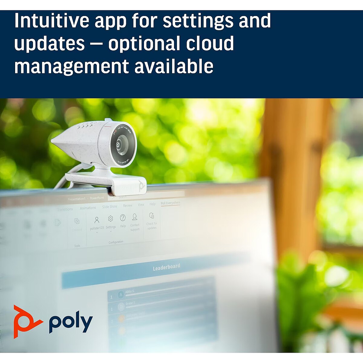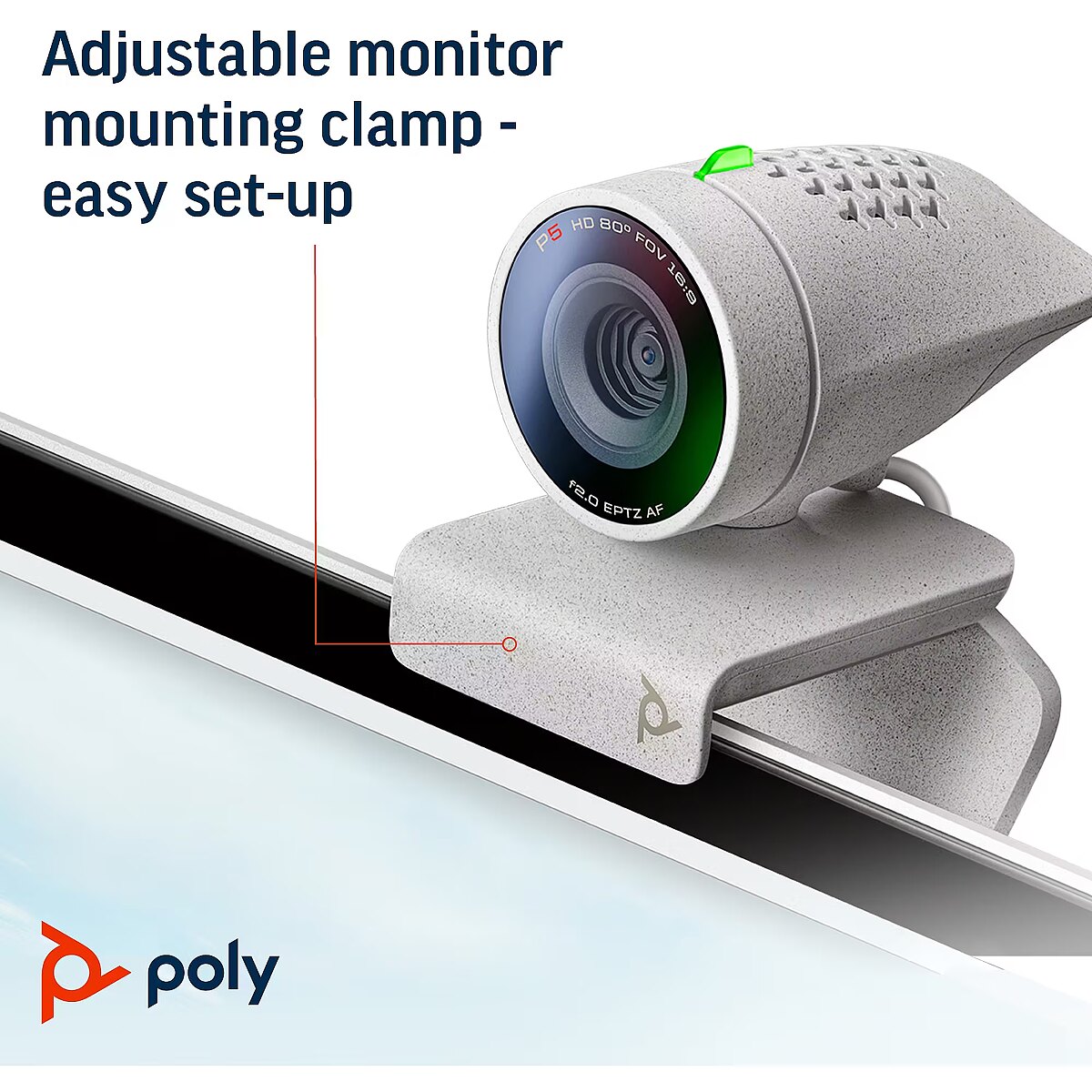 LongDesc - The Poly Studio P5 webcam ensures you look great on video calls at home, in the office, or wherever you’re working. Quality camera optics are fine-tuned so you come across clearly with a powerful, professional-quality image. The Poly Studio P5 webcam ensures you look your best on video calls at home, in the office, or wherever you’re working.Quality camera opticsPut your best foot forward on every call with optics specially designed for video conferencing. Gain confidence that you are clearly seen with brilliant colors designed to show you at your best.Low-light compensationDon’t let imperfect lighting deteriorate your image during a call. Automatic low-light compensation lets you look your best even in dim environments.Precise camera viewWith people working from more places, background movement, clutter, and household members can detract from your calls. A narrow field of view keeps the focus on the conversation at hand rather than your surroundings.Pro-grade resolutionA grainy video feed can be distracting for colleagues. With 1080p resolution and a 4x digital zoom camera, you can be sure that your video is crystal clear.Directional microphoneYou’re heard clearly with a built-in directional microphone that focuses on your voice, not the noise around you.