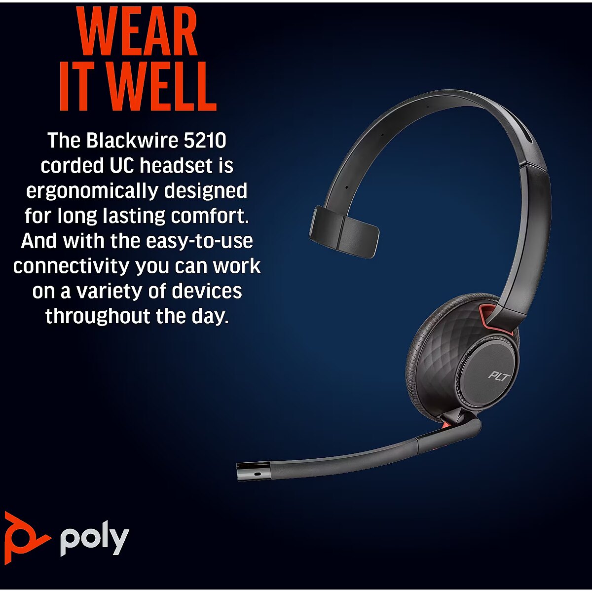 LongSummaryDescription - POLY Blackwire 5210 Monaural USB-C Headset +3.5mm Plug +USB-C/A Adapter. Product type: Headset. Connectivity technology: Wired. Recommended usage: Office/Call center, Cable length: 116 m. Weight: 165.2 g. Product colour: Black