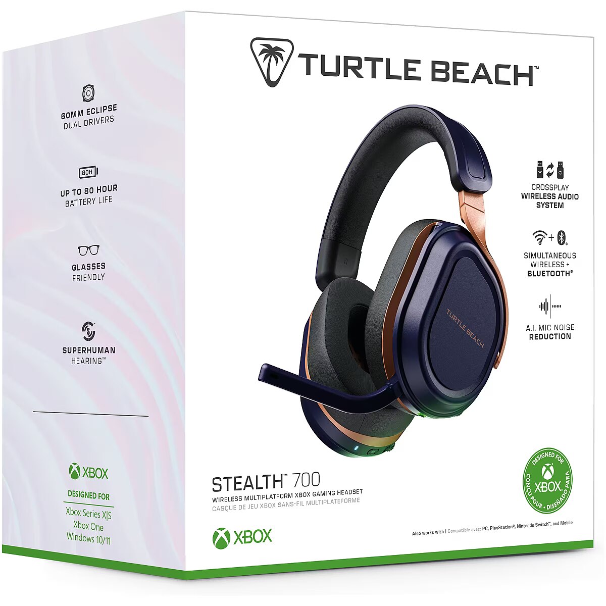 LongDesc - The Turtle Beach® Stealth™ 700 wireless multiplatform gaming headset for Xbox®, PlayStation®, PC, Steam Deck™ and mobile is redesigned for a 3rd generation of premium gaming prowess. The all-new CrossPlay wireless system with dual USB transmitters and simultaneous Bluetooth® connectivity delivers quick and easy connection to gaming consoles, PC & mobile devices. Huge, 60mm Eclipse™ Dual Drivers deliver unparalleled audio quality, and the Gen 3, flip-to-mute mic with A.I. noise cancellation allows for exceptionally clear voice accuracy. Plus, using the Swarm™ II companion app, you can adjust your microphone & audio settings to your exact, customized preference. Dominate for hours in complete comfort with a best-in-class 80-hour battery life, and memory foam ear cushions.