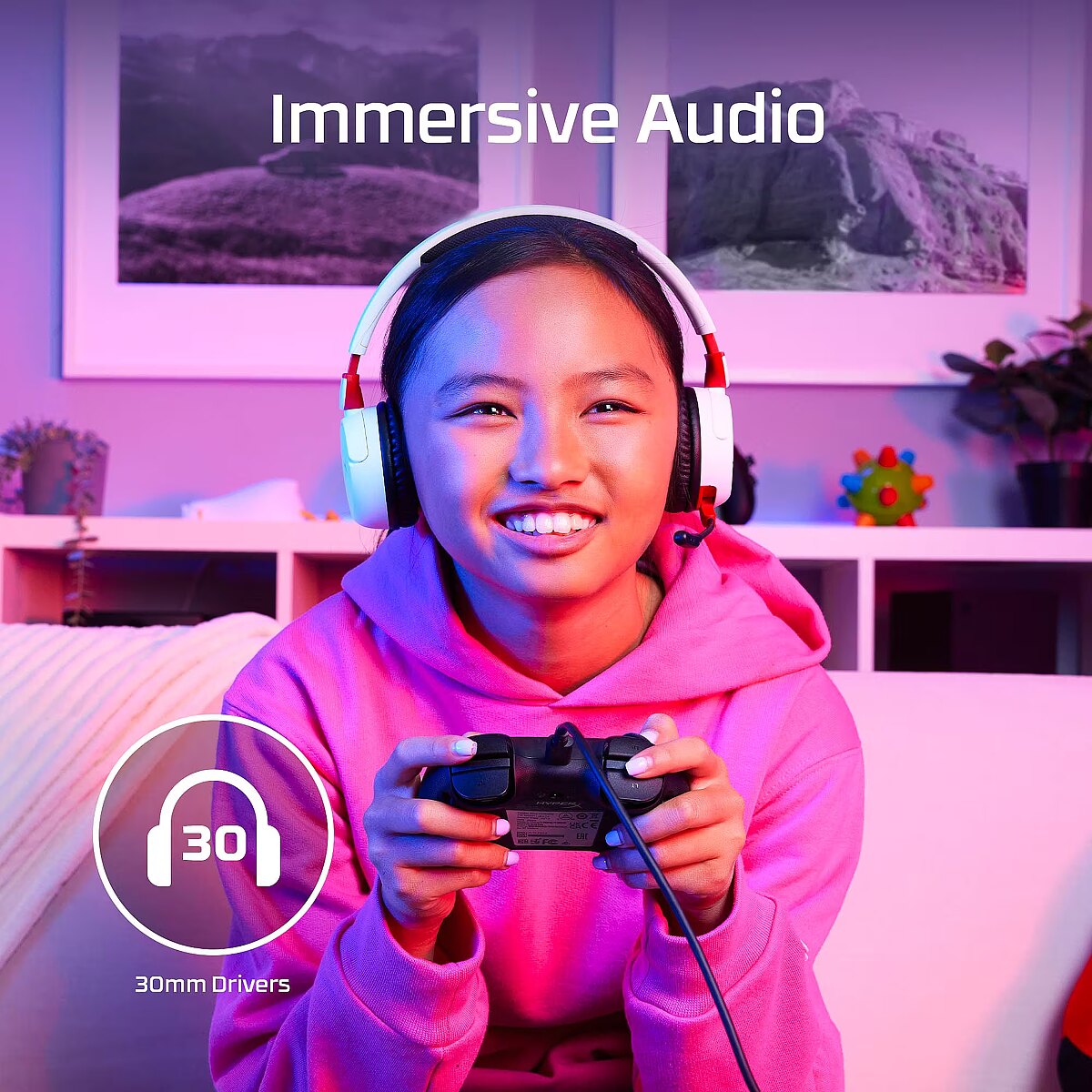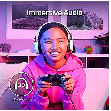 LongDesc - Designed for growing gamers.The HyperX Cloud Mini is a comfortable wireless headset built for upcoming gamers. Recommended for ages 8-12, it’s lightweight and appropriately sized for younger gamers, and more importantly, it’s designed to keep audio levels below 85dB[1]. With up to 25 hours of battery life, it’s perfect for flights, or gaming sessions[2]. Easy pairing over Bluetooth provides wireless freedom that means you won’t have to worry about cable snags and clutter. It features a clear, flip-to-mute mic so younger gamers can chat with their friends online, and it can be tucked away when not in use***. The earcups can be rotated when it’s time to take a break, and they’re also great for easy transport or storage. Cloud Mini Wireless can easily connect to Bluetooth compatible devices, as well as any device with a 3.5mm connection[4]. Whether your young gamer is playing on mobile, Nintendo Switch, PlayStation, PC, Chromebook, Steam Deck, or elsewhere, this versatile headset will be ready for it[5].