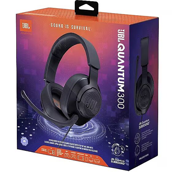 LongDesc - Step up your game with superior audio. JBL Quantum 300 wired headset creates a new level of immersion thanks to JBL QuantumSOUND Signature and accurate audio positioning. JBL QuantumSURROUND™ generates a realistic soundscape that drops you in the middle of the action, gives you an edge, and maximizes your performance on your PC. Designed for durability, the lightweight headband and memory-foam ear cushions keep you comfortable. A flip-up, voice focus boom mic keeps the communication flowing with both allies and enemies. Live the game with JBL QuantumSURROUND™Through advanced algorithms and the addition of overhead audio, JBL QuantumSURROUND™ powered by the JBL QuantumENGINE PC software creates an incredibly realistic spatial soundstage for cinematic levels of immersion and a true audio edge over the competition. Be at the center of the game with JBL QuantumSOUND SignatureFrom the tiniest footsteps to the loudest explosions. JBL QuantumSOUND Signature makes every scene epic and every gamer more competitive. The 50mm neodymium drivers deliver a sound curve designed specifically for gaming. Immerse yourself in the most realistic soundscape for a competitive advantage in any battle. Play even longer in memory foam comfortThe lightweight headband and memory foam ear cushions were designed for even the longest gaming sessions. Detachable ear cushions make the headset easy to clean. Be heard with the voice focus directional boom micJBL Quantum 300 headset lets you rally the troops and opponents with clarity. The flip-up, voice focus directional boom mic enables crystal clear communications with both allies and enemies.Optimized for PC, compatible with multiple platforms.The JBL Quantum 300 headset is compatible via 3.5mm jack with PC, PlayStation™*, Xbox™**, Nintendo Switch™, Mobile, Mac and VR. You can also use 3.5mm jack to USB converter cable to use the headset via USB on PC, PlayStation and Mac. The features powered by JBL QuantumENGINE (JBL QuantumSURROUND, RGB, EQ, Microphone settings etc.) are only available on PC. Check the connectivity guide for compatibility. *Compatible with PlayStation (PS5 and PS4) **Compatible with Xbox (Xbox Series X | S and One)User-friendly JBL QuantumENGINE PC software suiteJBL's unique JBL QuantumENGINE PC software powers the immersive surround sound. Select your preferred surround sound settings and personalize your JBL Quantum 300 gaming headset from a user-friendly dashboard, creating separate profiles. You can also adjust the equalizer or choose from 6 presets.