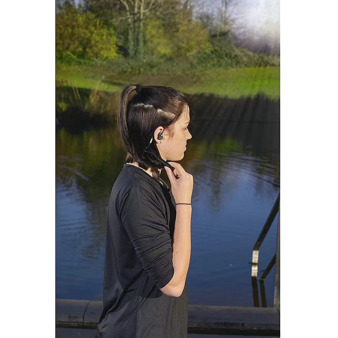 The in-ear wireless headphones are connected by a flexible headband to wrap around the ears, which ensures a stable fit. You don't have to worry about the headphones falling out during intense movements, e.g. while running.