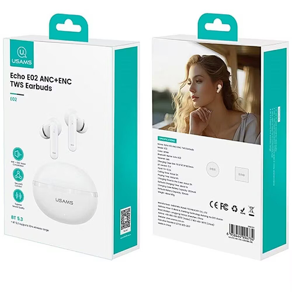 Description - USAMS Echo E02 TWS ANC+ENC Wireless Bluetooth Headphones USAMS is a renowned brand specializing in the design and production of premium electronic accessories. Known for its innovative approach and stylish design, it offers a wide range of products, including mobile phone accessories, chargers, and other electronic devices. Focusing on quality, durability, and functionality, it combines modern technology with exceptional craftsmanship. Unique appearance and exceptional quality The metal surface has an elegant, gradient finish that combines durability with oxidation resistance. The colors are vibrant and visually appealing. The latest technologies Thanks to active noise cancellation (ANC), you can enjoy crystal-clear sound, eliminating ambient noise and creating the perfect environment for listening to music or making calls. Additionally, the ENC function effectively filters out background noise during calls, ensuring your voice is always clear and intelligible. Performance and functionality The headphones are equipped with the latest Bluetooth version 5.3 , which ensures a stable connection and quick pairing with devices. Docking station and power bank in one Enjoy up to 4 hours of uninterrupted music playback on a single charge. The charging case also doubles as a power bank, allowing you to listen to your favorite tunes longer. So you'll never have to worry about running out of battery again! Control with touch! The introduction of a touch panel to the headphones allows for intuitive control using simple touch gestures. This modern technology simplifies their operation, making them even easier and more enjoyable to use!