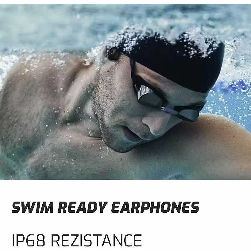 IP68 vērtējums nodrošina pilnīgu aizsardzību pret ūdeni un putekļiem, tāpēc jums nav jāuztraucas par ilgiem treniņiem ūdenī. Augstākās kvalitātes silikona materiāls ērti pieguļ, nerada spiedienu un ir izturīgs pret sviedriem, hloru un sālsūdeni. Būtiska priekšrocība ir iebūvētā 32 GB atmiņa, kas ļauj ērti augšupielādēt mūziku tieši no tālruņa, izmantojot magnētisko uzlādes savienotāju – dators nav nepieciešams.