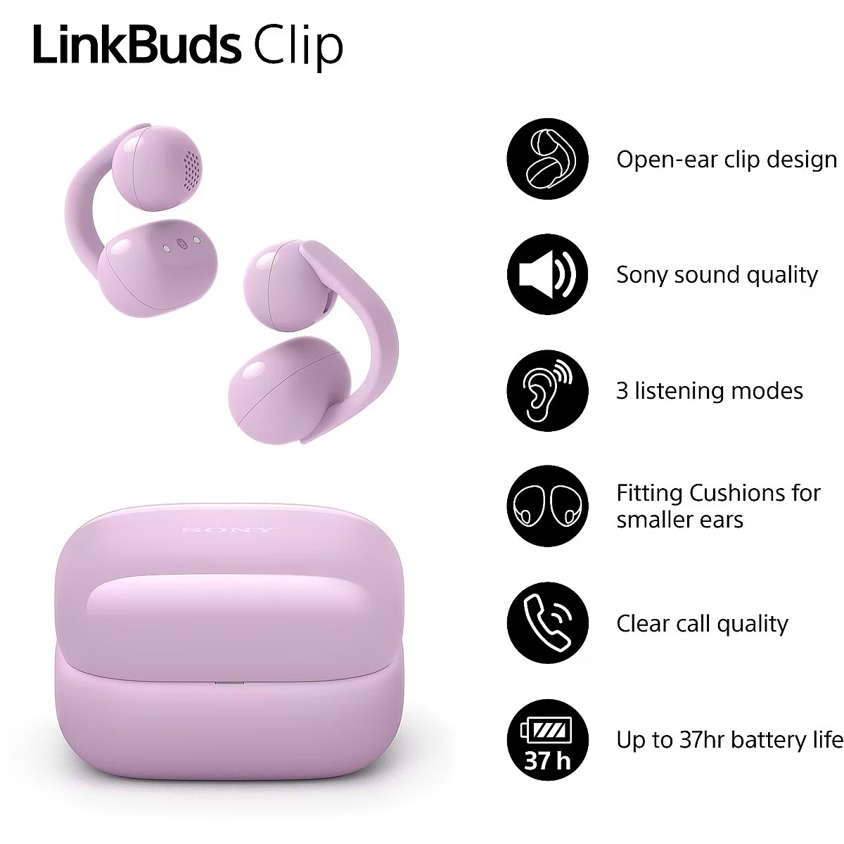 Kerge ja vaevumärgatav disain. Kohanda sobivust kõrvapadjakestega, et saavutada kindel istuvus just Sinu kõrvades. Igapäevaseks kuulamiseks loodud Kuni 37 tundi aku tööaega koos laadimiskarbiga Stabiilne Bluetooth ühendus ja multipoint tugi IPX4 veekindlus – sobib tööks, sportimiseks ja igapäevaseks kasutamiseks Sony LinkBuds Clip ühendavad loomuliku kuulamiskogemuse, mugavuse ja töökindluse – et oleksid elule avatud igal hetkel.
