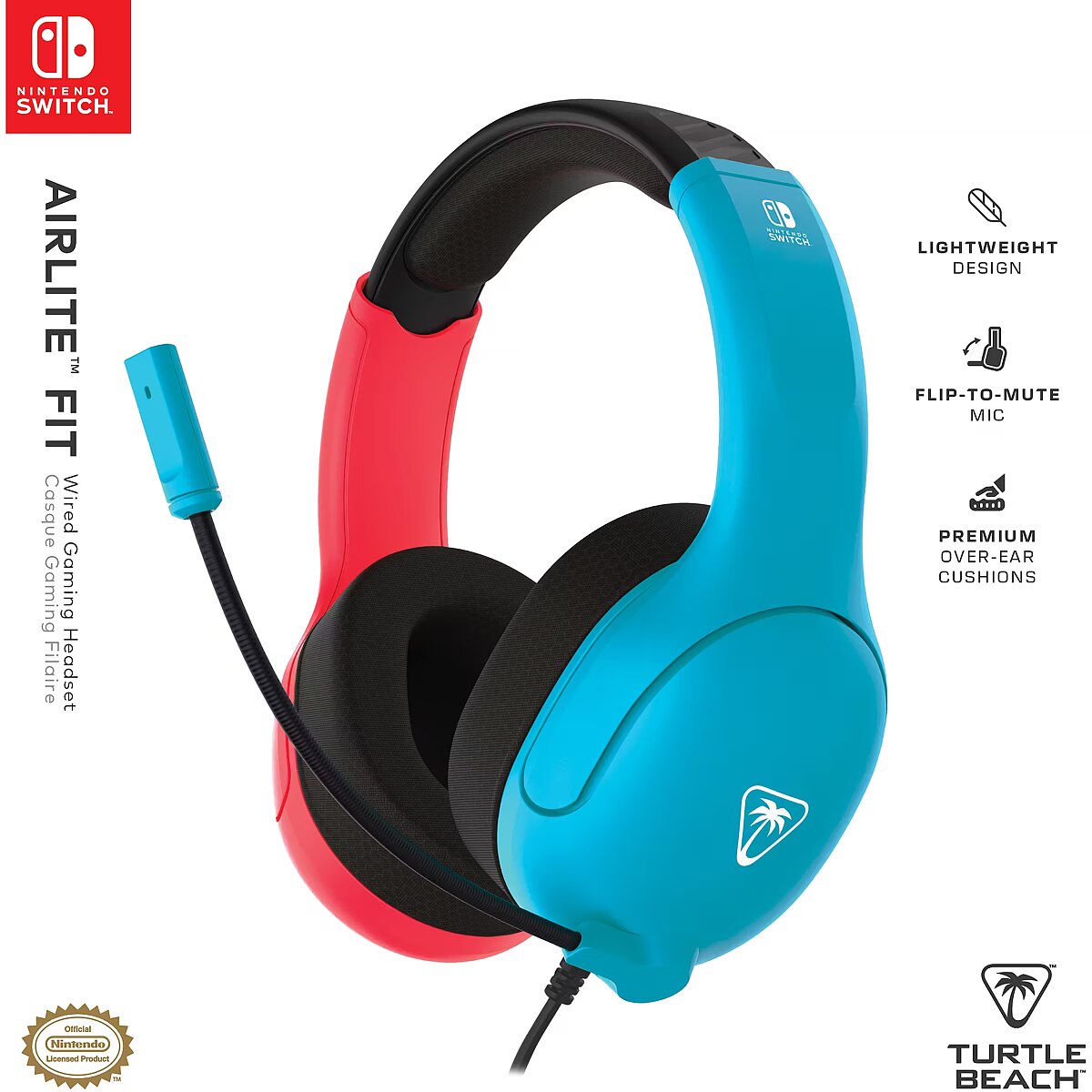 Title - Turtle Beach Airlite Fit Neon Blue and Red Wired Gaming Headset with Flip-to-Mute Mic, Over-Ear Premium Comfort and 40mm Speakers. Officially Licensed for Nintendo Switch