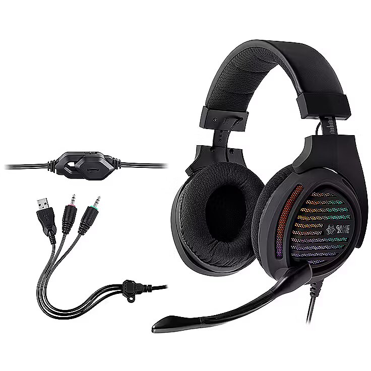 ShortDescription - słuchawki nauszne | przewodowe jack 2x3,5mm + USB do podświetlenia | mikrofon ruchomy | przewód 2,2m