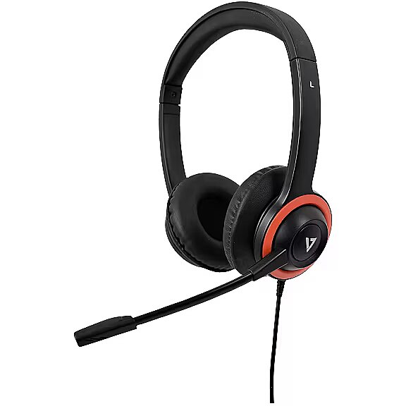 Title - V7 Safesound Education k-12 Headset with Microphone, volume limited, antimicrobial, 2m cable, 3.5mm, Laptop Computer, Chromebook, PC - Black, Red