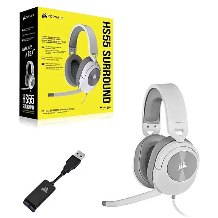 Description - HS55 SURROUND Wired Gaming Headset White (EU) The CORSAIR HS55 SURROUND gaming headset delivers essential all-day comfort and sound quality with leatherette ear cups with memory foam, Dolby Audio 7.1 surround sound on PC and Mac, and a lightweight design. The omni-directional microphone allows you to convey your voice loud and clear, and the 3.5 mm audio connector ensures a wide range of compatibility with most devices.