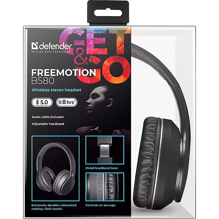 Description - Defender Bluetooth Headset Freemotion B580 Wireless Bluetooth headset Built-in microphone Control keys on the headset Audio cable included Battery life of up to 8 hours Adjustable headband Compact foldable design Metal headband base Durable "Soft Touch" rubber coating
