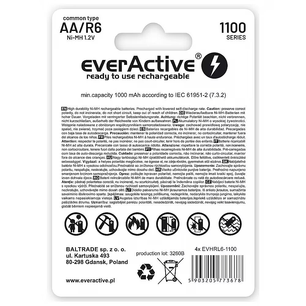 Description - 4 x innovative R6 AA 1100 mAh everActive battery made in "ready to use" technology. Infinity Line series - dedicated to solar lamps, cordless phones and all devices with moderate and low energy requirements. Perfect as a replacement for disposable batteries in devices where other batteries have not yet had economic or ecological justification.