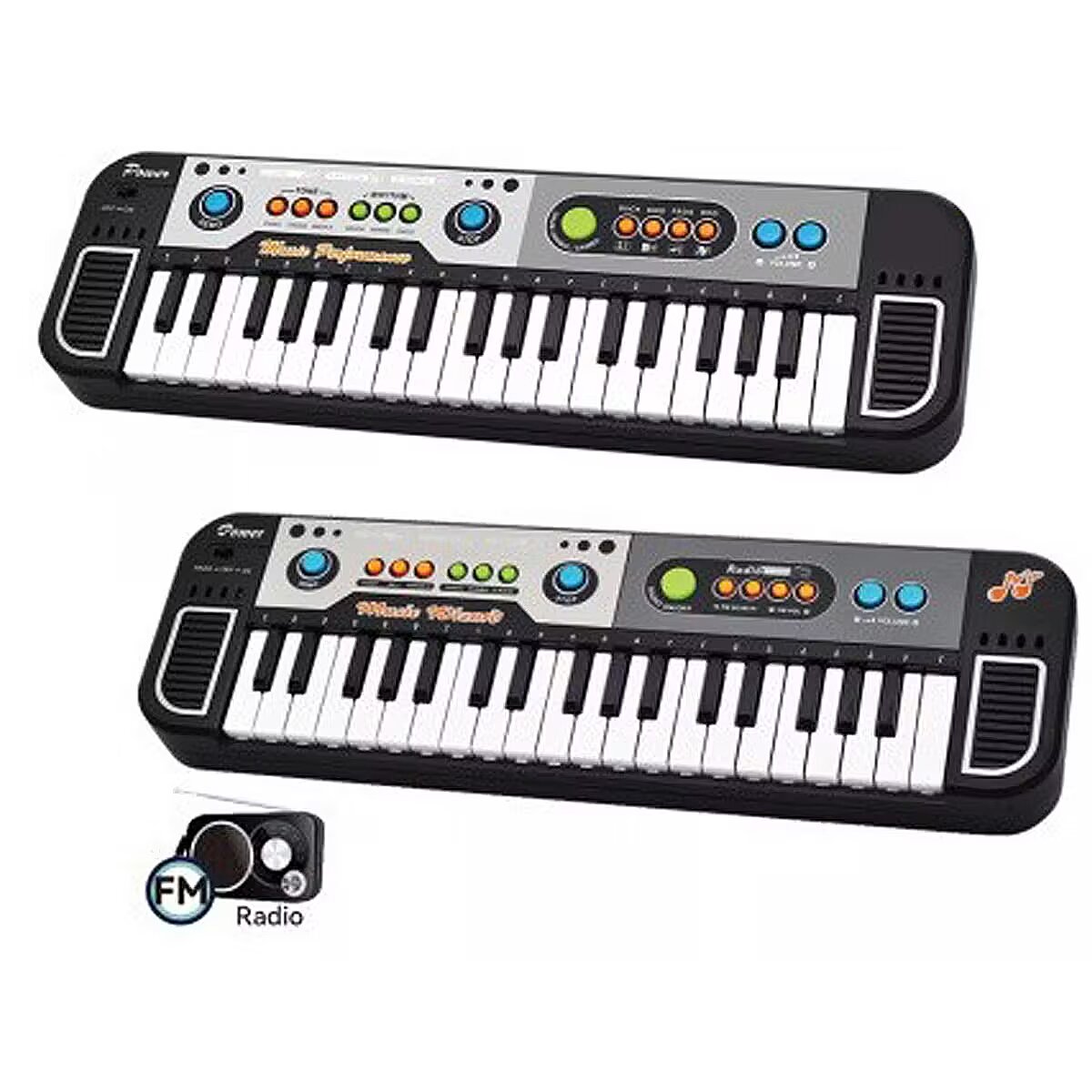 Description - Musical Keyboard 37 keys by Madej This unique product not only provides entertainment but also develops musical skills at any age.  With 37 keys, FM Radio and an FM scanner, the keyboard allows you to discover new sounds and melodic combinations. The volume control and microphone allow you to adjust the settings to your own preferences, making every music session unforgettable.  What's more, the 3 musical tones and 3 rhythms allow you to experiment with a variety of sounds and rhythms, which encourages creativity and the development of musical passions.  The Madej Keyboard is an excellent choice for children aged 3 and over. Made of high-quality plastic, it meets the highest safety standards, giving parents peace of mind.  The black and grey design makes the keyboard look modern and stylish, encouraging creative time.