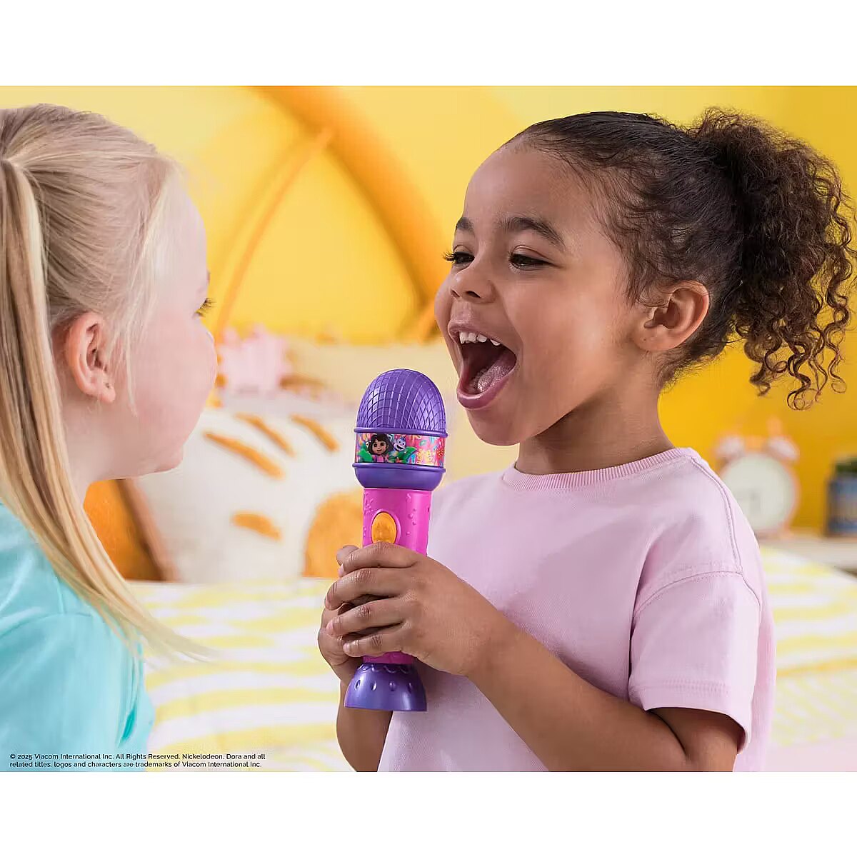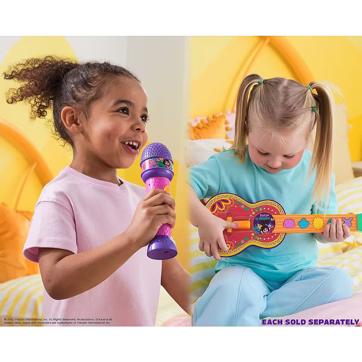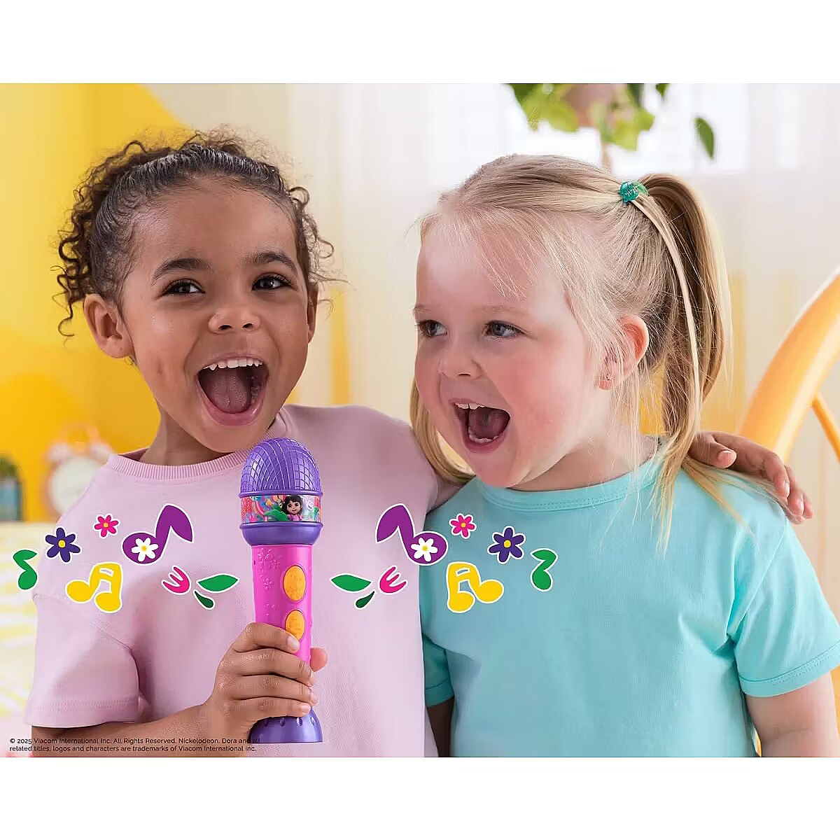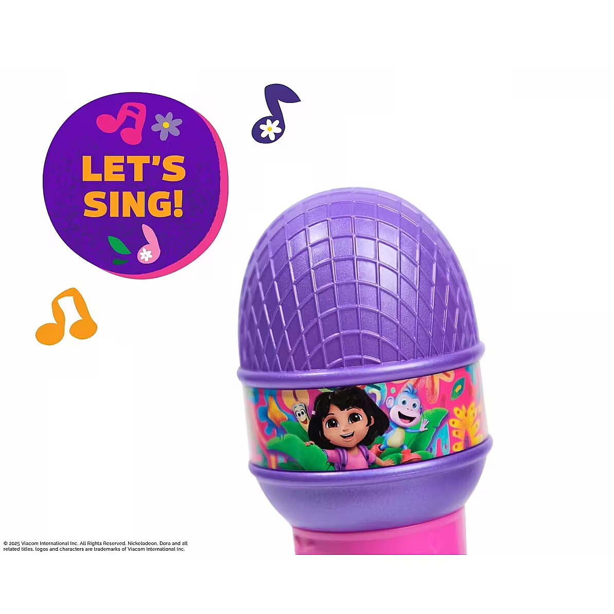 Description - Dora Mikrofon z efektami dźwiękowymi Przygotuj się na śpiewanie, taniec i eksplorowanie świata z mikrofonem Dory, który posiada efekty dźwiękowe. Ten kolorowy, dziecięcy mikrofon zawiera 5 ulubionych piosenek Dory oraz dwujęzyczne zwroty wypowiadane przez Dorę i Butka. Dzięki przyciskom do odtwarzania muzyki i nagrań głosowych dzieci mogą nacisnąć przycisk z Dorą, aby zaśpiewać razem takie hity jak "We Did It" czy "Todo Juntos", lub przycisk z Butkiem, by usłyszeć popularne zwroty, takie jak "That's banana-riffic!". Mikrofon ma poręczny rozmiar - 19,5 cm wysokości - idealny dla maluchów. W zestawie znajdują się dwie baterie AAA oraz specjalna karta kolekcjonerska, którą pokochają mali fani Dory. Wkrocz do świata Dory z zabawkami dla najmłodszych, które będą magicznym prezentem urodzinowym, bożonarodzeniowym i świątecznym dla dziewczynek i chłopców uwielbiających zabawki takie jak lalki i akcesoria oraz mebelki do domku dla lalek. Aby przeżyć jeszcze więcej przygód z Dorą, zbuduj własny "Świat Dory" - z Domkiem w Dżungli wyglądającym jak ten z serialu, uroczymi figurkami, interaktywnymi lalkami, super uroczymi pluszakami oraz muzycznymi instrumentami i innymi zestawami pełnymi przygód. (Każdy produkt sprzedawany oddzielnie.)
