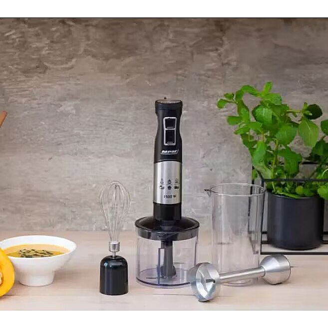 Description - MBL-34M hand blender BLEND WITH PASSION, COOK WITH FINEsse Introduce creative cooking to your kitchen with the MBL-34M multi-tasking blender with additional accessories, which will turn your culinary dreams into reality. From precise mixing, through grinding ingredients, to whipping foam for fluffy desserts. You can freely adjust the speed of the blender to the dishes you are preparing, you can also use the Turbo function when you need a quick result or when you are mixing hard ingredients. Ergonomic design and stainless steel casing will ensure that the device will serve you for many years. Let your imagination run wild and discover how easily you can create culinary masterpieces in your own kitchen. POWER IN YOUR HANDS Adjust the blender speed to suit your culinary needs. The convenient ring at the top of the handle allows you to set the blender's power to one of nine levels. Start blending at low speed and gradually increase it. You will avoid possible splashing and will be able to control the degree of grinding of the ingredients. Use the Turbo function when you need a quick result or when mixing frozen ingredients. ENDLESS COOKING POSSIBILITIES Discover the magic of experimenting in the kitchen with MBL-34M. A high-quality device with a variety of accessories not only facilitates everyday cooking, but also inspires innovative ideas. The set includes: a 500 ml container with a stainless steel knife for mincing and chopping - ideal for meat, cheese, fruit, nuts and vegetables, a stainless steel mixing attachment for preparing cocktails, soups, purees - adapted to work at high temperatures, an attachment for whipping egg whites and light sauces and a 700 ml container for storage. Create new flavors every day. STRONGER, FASTER, MORE EFFECTIVE The high power of the MBL-34M blender makes the device work faster and more efficiently. 1500 W is a powerful dose of power, thanks to which you can crush not only soft products, but also frozen strawberries, chocolate or nuts. Choose a solid device and enjoy its benefits for many years. DURABILITY AND RELIABILITY Are you looking for a durable device for kitchen experiments? The stainless steel housing of the MBL-34M blender is highly resistant to scratches and mechanical damage, which guarantees long-term use and allows you to prepare tasty dishes for many years. Choose effective and reliable equipment that will stay with you for a long time!