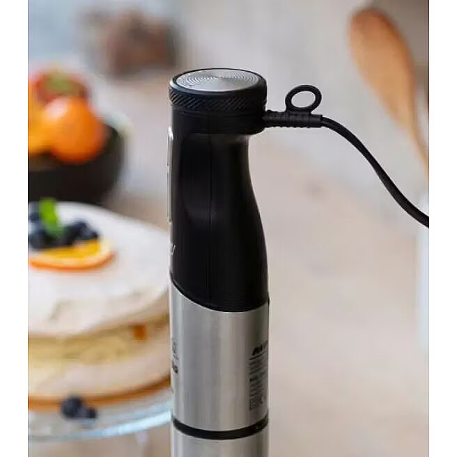 Description - MBL-34M hand blender BLEND WITH PASSION, COOK WITH FINEsse Introduce creative cooking to your kitchen with the MBL-34M multi-tasking blender with additional accessories, which will turn your culinary dreams into reality. From precise mixing, through grinding ingredients, to whipping foam for fluffy desserts. You can freely adjust the speed of the blender to the dishes you are preparing, you can also use the Turbo function when you need a quick result or when you are mixing hard ingredients. Ergonomic design and stainless steel casing will ensure that the device will serve you for many years. Let your imagination run wild and discover how easily you can create culinary masterpieces in your own kitchen. POWER IN YOUR HANDS Adjust the blender speed to suit your culinary needs. The convenient ring at the top of the handle allows you to set the blender's power to one of nine levels. Start blending at low speed and gradually increase it. You will avoid possible splashing and will be able to control the degree of grinding of the ingredients. Use the Turbo function when you need a quick result or when mixing frozen ingredients. ENDLESS COOKING POSSIBILITIES Discover the magic of experimenting in the kitchen with MBL-34M. A high-quality device with a variety of accessories not only facilitates everyday cooking, but also inspires innovative ideas. The set includes: a 500 ml container with a stainless steel knife for mincing and chopping - ideal for meat, cheese, fruit, nuts and vegetables, a stainless steel mixing attachment for preparing cocktails, soups, purees - adapted to work at high temperatures, an attachment for whipping egg whites and light sauces and a 700 ml container for storage. Create new flavors every day. STRONGER, FASTER, MORE EFFECTIVE The high power of the MBL-34M blender makes the device work faster and more efficiently. 1500 W is a powerful dose of power, thanks to which you can crush not only soft products, but also frozen strawberries, chocolate or nuts. Choose a solid device and enjoy its benefits for many years. DURABILITY AND RELIABILITY Are you looking for a durable device for kitchen experiments? The stainless steel housing of the MBL-34M blender is highly resistant to scratches and mechanical damage, which guarantees long-term use and allows you to prepare tasty dishes for many years. Choose effective and reliable equipment that will stay with you for a long time!
