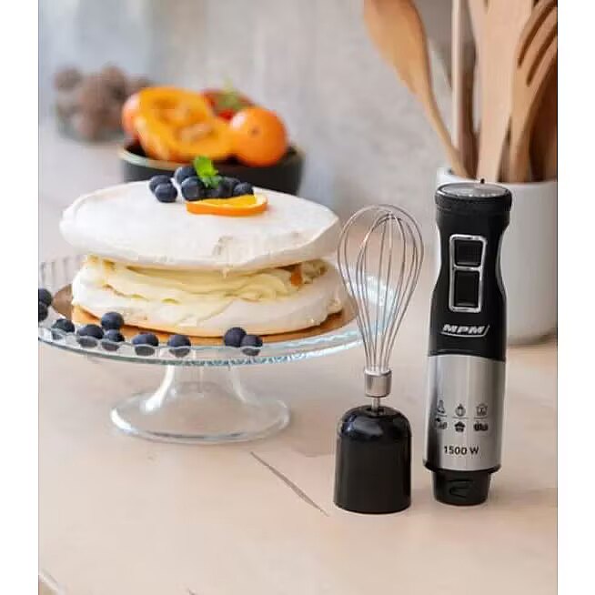 Description - MBL-34M hand blender BLEND WITH PASSION, COOK WITH FINEsse Introduce creative cooking to your kitchen with the MBL-34M multi-tasking blender with additional accessories, which will turn your culinary dreams into reality. From precise mixing, through grinding ingredients, to whipping foam for fluffy desserts. You can freely adjust the speed of the blender to the dishes you are preparing, you can also use the Turbo function when you need a quick result or when you are mixing hard ingredients. Ergonomic design and stainless steel casing will ensure that the device will serve you for many years. Let your imagination run wild and discover how easily you can create culinary masterpieces in your own kitchen. POWER IN YOUR HANDS Adjust the blender speed to suit your culinary needs. The convenient ring at the top of the handle allows you to set the blender's power to one of nine levels. Start blending at low speed and gradually increase it. You will avoid possible splashing and will be able to control the degree of grinding of the ingredients. Use the Turbo function when you need a quick result or when mixing frozen ingredients. ENDLESS COOKING POSSIBILITIES Discover the magic of experimenting in the kitchen with MBL-34M. A high-quality device with a variety of accessories not only facilitates everyday cooking, but also inspires innovative ideas. The set includes: a 500 ml container with a stainless steel knife for mincing and chopping - ideal for meat, cheese, fruit, nuts and vegetables, a stainless steel mixing attachment for preparing cocktails, soups, purees - adapted to work at high temperatures, an attachment for whipping egg whites and light sauces and a 700 ml container for storage. Create new flavors every day. STRONGER, FASTER, MORE EFFECTIVE The high power of the MBL-34M blender makes the device work faster and more efficiently. 1500 W is a powerful dose of power, thanks to which you can crush not only soft products, but also frozen strawberries, chocolate or nuts. Choose a solid device and enjoy its benefits for many years. DURABILITY AND RELIABILITY Are you looking for a durable device for kitchen experiments? The stainless steel housing of the MBL-34M blender is highly resistant to scratches and mechanical damage, which guarantees long-term use and allows you to prepare tasty dishes for many years. Choose effective and reliable equipment that will stay with you for a long time!