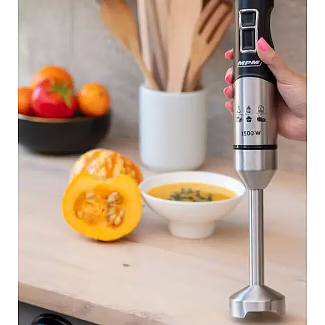 Description - MBL-34M hand blender BLEND WITH PASSION, COOK WITH FINEsse Introduce creative cooking to your kitchen with the MBL-34M multi-tasking blender with additional accessories, which will turn your culinary dreams into reality. From precise mixing, through grinding ingredients, to whipping foam for fluffy desserts. You can freely adjust the speed of the blender to the dishes you are preparing, you can also use the Turbo function when you need a quick result or when you are mixing hard ingredients. Ergonomic design and stainless steel casing will ensure that the device will serve you for many years. Let your imagination run wild and discover how easily you can create culinary masterpieces in your own kitchen. POWER IN YOUR HANDS Adjust the blender speed to suit your culinary needs. The convenient ring at the top of the handle allows you to set the blender's power to one of nine levels. Start blending at low speed and gradually increase it. You will avoid possible splashing and will be able to control the degree of grinding of the ingredients. Use the Turbo function when you need a quick result or when mixing frozen ingredients. ENDLESS COOKING POSSIBILITIES Discover the magic of experimenting in the kitchen with MBL-34M. A high-quality device with a variety of accessories not only facilitates everyday cooking, but also inspires innovative ideas. The set includes: a 500 ml container with a stainless steel knife for mincing and chopping - ideal for meat, cheese, fruit, nuts and vegetables, a stainless steel mixing attachment for preparing cocktails, soups, purees - adapted to work at high temperatures, an attachment for whipping egg whites and light sauces and a 700 ml container for storage. Create new flavors every day. STRONGER, FASTER, MORE EFFECTIVE The high power of the MBL-34M blender makes the device work faster and more efficiently. 1500 W is a powerful dose of power, thanks to which you can crush not only soft products, but also frozen strawberries, chocolate or nuts. Choose a solid device and enjoy its benefits for many years. DURABILITY AND RELIABILITY Are you looking for a durable device for kitchen experiments? The stainless steel housing of the MBL-34M blender is highly resistant to scratches and mechanical damage, which guarantees long-term use and allows you to prepare tasty dishes for many years. Choose effective and reliable equipment that will stay with you for a long time!
