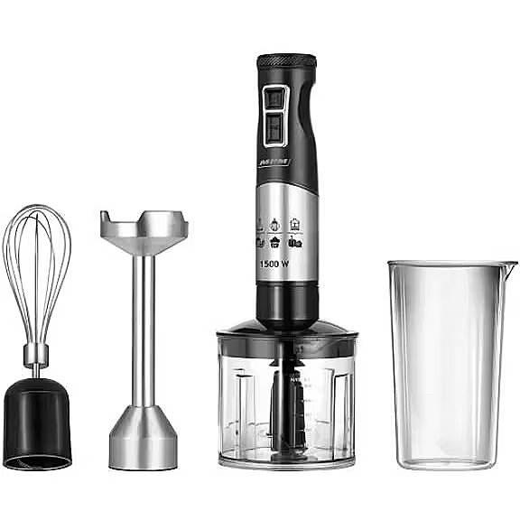 Description - MBL-34M hand blender BLEND WITH PASSION, COOK WITH FINEsse Introduce creative cooking to your kitchen with the MBL-34M multi-tasking blender with additional accessories, which will turn your culinary dreams into reality. From precise mixing, through grinding ingredients, to whipping foam for fluffy desserts. You can freely adjust the speed of the blender to the dishes you are preparing, you can also use the Turbo function when you need a quick result or when you are mixing hard ingredients. Ergonomic design and stainless steel casing will ensure that the device will serve you for many years. Let your imagination run wild and discover how easily you can create culinary masterpieces in your own kitchen. POWER IN YOUR HANDS Adjust the blender speed to suit your culinary needs. The convenient ring at the top of the handle allows you to set the blender's power to one of nine levels. Start blending at low speed and gradually increase it. You will avoid possible splashing and will be able to control the degree of grinding of the ingredients. Use the Turbo function when you need a quick result or when mixing frozen ingredients. ENDLESS COOKING POSSIBILITIES Discover the magic of experimenting in the kitchen with MBL-34M. A high-quality device with a variety of accessories not only facilitates everyday cooking, but also inspires innovative ideas. The set includes: a 500 ml container with a stainless steel knife for mincing and chopping - ideal for meat, cheese, fruit, nuts and vegetables, a stainless steel mixing attachment for preparing cocktails, soups, purees - adapted to work at high temperatures, an attachment for whipping egg whites and light sauces and a 700 ml container for storage. Create new flavors every day. STRONGER, FASTER, MORE EFFECTIVE The high power of the MBL-34M blender makes the device work faster and more efficiently. 1500 W is a powerful dose of power, thanks to which you can crush not only soft products, but also frozen strawberries, chocolate or nuts. Choose a solid device and enjoy its benefits for many years. DURABILITY AND RELIABILITY Are you looking for a durable device for kitchen experiments? The stainless steel housing of the MBL-34M blender is highly resistant to scratches and mechanical damage, which guarantees long-term use and allows you to prepare tasty dishes for many years. Choose effective and reliable equipment that will stay with you for a long time!