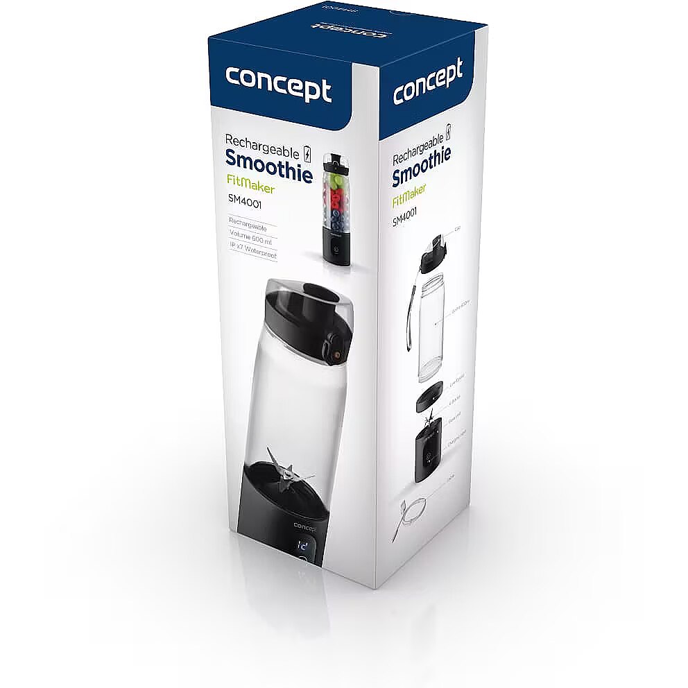 Smoothie FitMaker Concept SM4001 wytrzymuje do 40 cykli miksowania po 20 sekund na jednym ładowaniu. Można go w pełni naładować w ciągu 4 godzin za pomocą magnetycznej ładowarki USB. Obsługuje się go za pomocą jednego przycisku. Łatwe czyszczenie