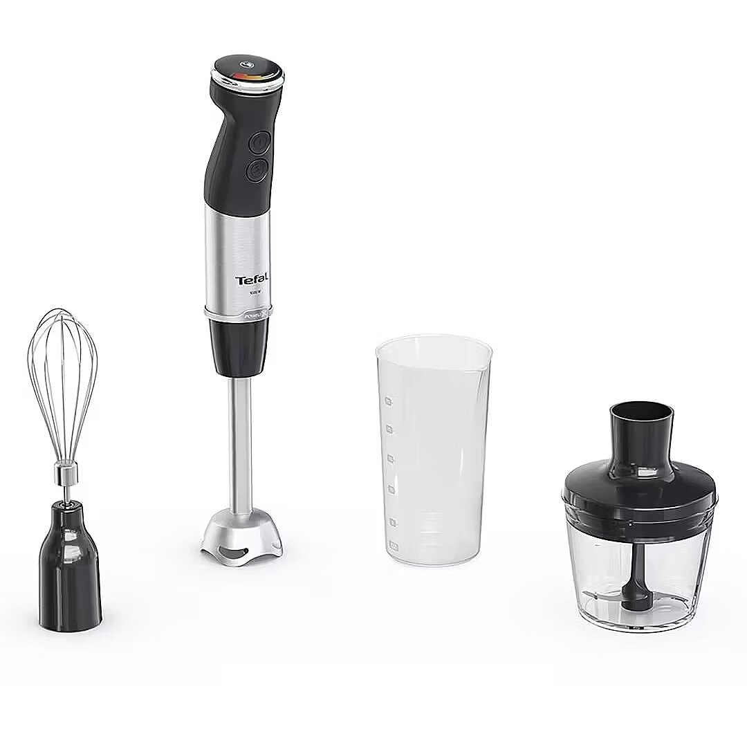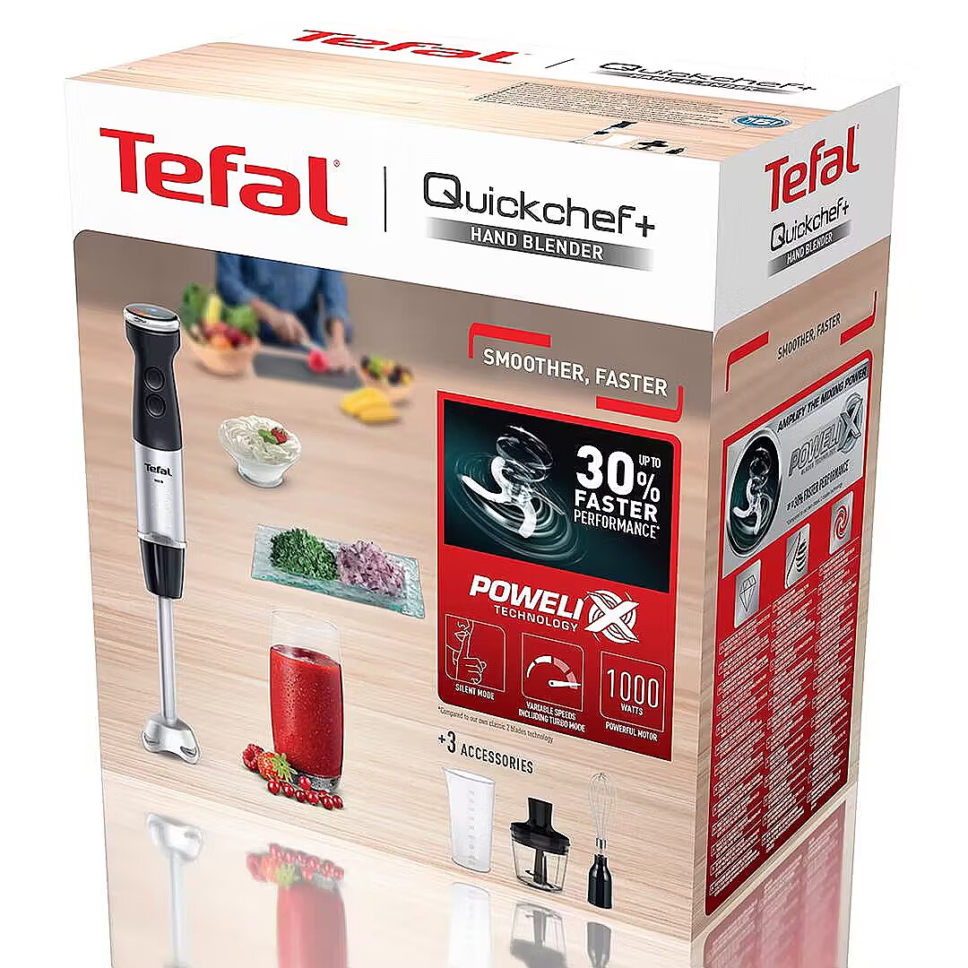 MediumDescription EN - Incredible smoothness at your fingertips With the Quickchef+ Hand Blender by Tefal, enjoy optimum power with none of the effort. Exclusive Powelix Blades Technology comes together with a powerful 1000 W motor for high-performance blending that's up to 30% faster* with incredibly smooth results on even the hardest ingredients — with silence mode and a whole range of convenient features to round off the package. • Upgrade your culinary game with a compact chopper for perfect chopping and grinding, the whisk for egg whites and homemade mayonnaise, and a dosing beaker for easier blending