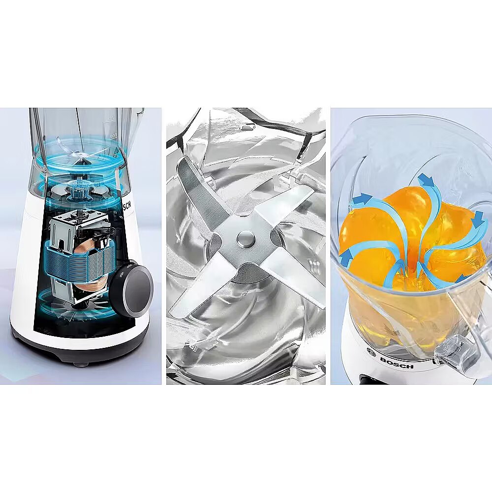 LongSummaryDescription - Bosch Serie 4 MMB6141W. Type: Tabletop blender, Product colour: White, Cord length: 1 m. Bowl capacity: 1.5 L, Control type: Rotary. Blending bowl material: Tritan, Housing material: Plastic. Power: 1200 W, Power source: AC, AC input voltage: 220 - 240 V. Width: 230 mm, Depth: 195 mm, Height: 410 mm