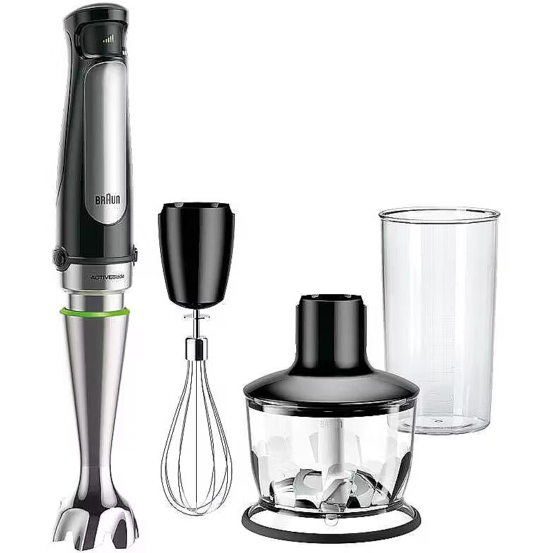 LongDesc - The new Braun MultiQuick 7 hand blender is designed to help you make healthy meals for your family and friends – fast and easy. It now features world’s first ACTIVEBlade technology. This innovative flexible shaft gives you 250 % more active cutting surface to work with* – a clever kitchen helper so you can get the job done easily. It also features Braun’s new Easy SmartSpeed technology, which puts you in control with just one touch. Simply apply pressure on the control button to adjust the power intuitively and without interruption. *Compared to Braun hand blenders with non ACTIVEBlade shaft.ACTIVEBlade technologyUnique ACTIVEBlades move up and down to easily blend the hardest foods with 40% less effort* due to a 250% more active cutting surface to work with. This also results in 2 times finer blending. *Compared to Braun hand blenders with non ACTIVEBlade shaft.Up to 55% lesssuction** for effortless handling and perfect control.SPLASHControl technologyAnti-splash design to ensure a spotless kitchen.POWERBell PLUSExtra milling blade. For less pre cutting. Blends whole foods in seconds.World's first Smart SpeedNo predefined speed settings, just follow your intuition: Depending on the results you want adjust the power intuitively with the simple squeeze of one button.EasyClick system PlusFaster attaching of EasyClick Plus accessories thanks to bigger, easier to use buttons and the intuitive straight cut design.ChopperChops meat, hard cheese, nuts, herbs and carrots in seconds.WhiskEasily whips, beats and stirs eggs, cream, fluffy dessert from low to high speed.Beaker600 ml plastic beaker, BPA free, with ml and fl oz measurements