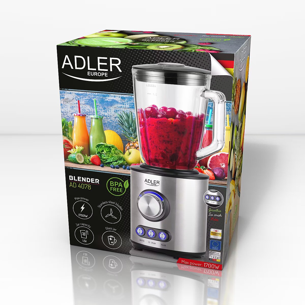 Name - Adler | Blender | AD 4078 | Tabletop | 1700 W | Jar material Glass | Jar capacity 1.5 L | Ice crushing | Stainless steel