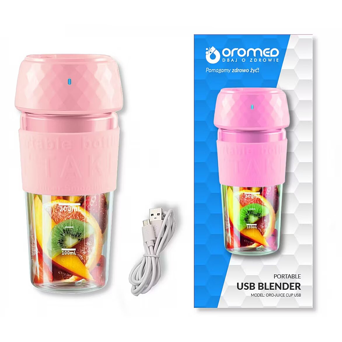 Description - Thanks to it, the ORO-JUCER CUP USB blender can have a freshly prepared smoothie wherever you want. A comfortable large-capacity water bottle with a silicone band will be perfect for people who value a healthy lifestyle and more. Thanks to a capacious 900 mAh battery, you can mix up to 10 glasses of juice. Easy to use and clean. Technologically innovative, leakproof, accident prevention magnetic switch. Made of special glass resistant to temperature and abrasion. The mixer is small in size: 187mm * 87mm * 87mm, you can take it with you for a walk, training or trip. It is easy to use. After crushing selected fruits and vegetables. Close the lid, hold the on button for 3 seconds and turn the device upside down. The engine with a power of 22,000 revolutions will easily blend our fruit and vegetables and prepare delicious juices, smoothes or shakes.