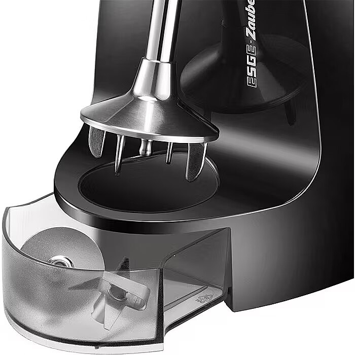 LongDesc - A glamorous eye-catcher for the kitchen: Accompanied by plenty of accessories, the ESGE-Zauberstab® M 200 Chrome presents itself in its stylish chrome outfit. The multi-knife and beater disc can be stored in the compact magic base, in which the magic wand has its permanent place on the worktop, ready to hand. The all-round carefree package also includes the chopper for herbs, nuts, chocolate or parmesan. A silicone storage tray for used cooking utensils is also included as standard - and the practical cleaning brush, with which the attachments can be cleaned in no time.