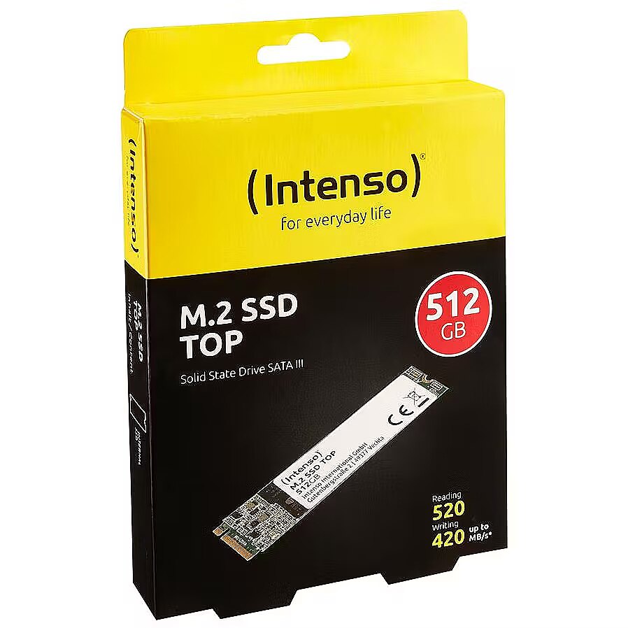 This Intenso brand SSD has a 512 GB capacity and a M.2 80mm (2280) format.