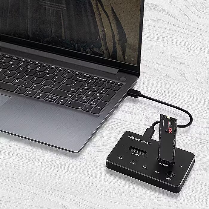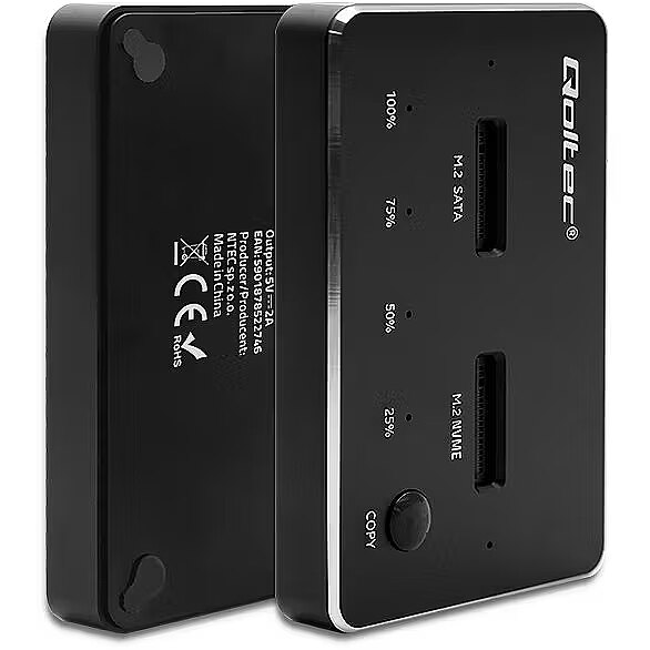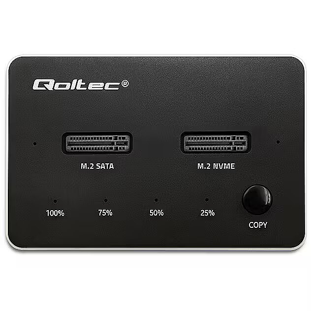 The station is compatible with M.2 drives with SATA and NVMe interfaces. It offers data transfer rates of up to 10 Gbps. In addition, the disk station from Qoltec is a device: Suitable for M-Key and B&M-Key NGFF SSDs with sizes: 2230, 2242, 2260, 2280, 22110, Support of the UASP standard, allows several commands to be executed at the same time, USB 3.1 Gen2 interface enables data transfer at a speed of 10 Gb/s, The device is compatible with USB 3.1 Gen1 and USB 2.0, Good stability of the device thanks to non-slip pads, LED indicates copy status (25%, 50%, 75%, 100%), Single M.2 drive supports up to 2TB, total capacity 4TB, Useful when there is no other way to connect an SSD, No need to install drivers, simply plug into a USB port and use thanks to the simplicity of the Plug&Play function. High-speed data transfer, two options for copying data